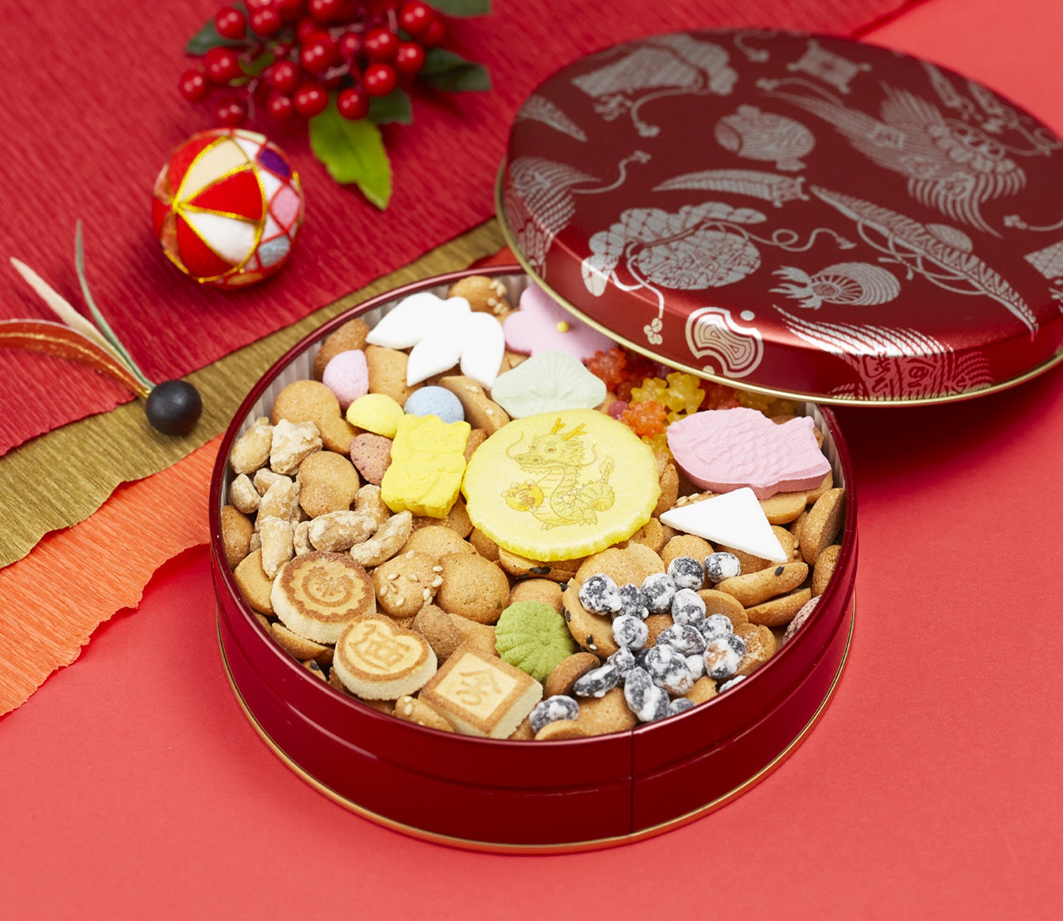 干支の辰の絵柄が入った麩焼き入り。年末年始のご挨拶にも毎年人気の限定缶です。