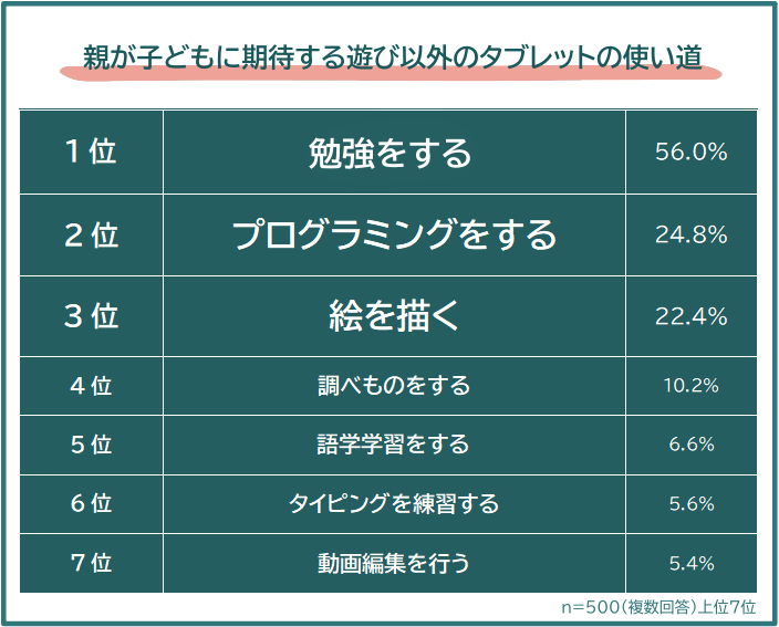 【子どものタブレット|遊び以外で期待する使い道ランキング 】小中学生の親500人アンケート調査