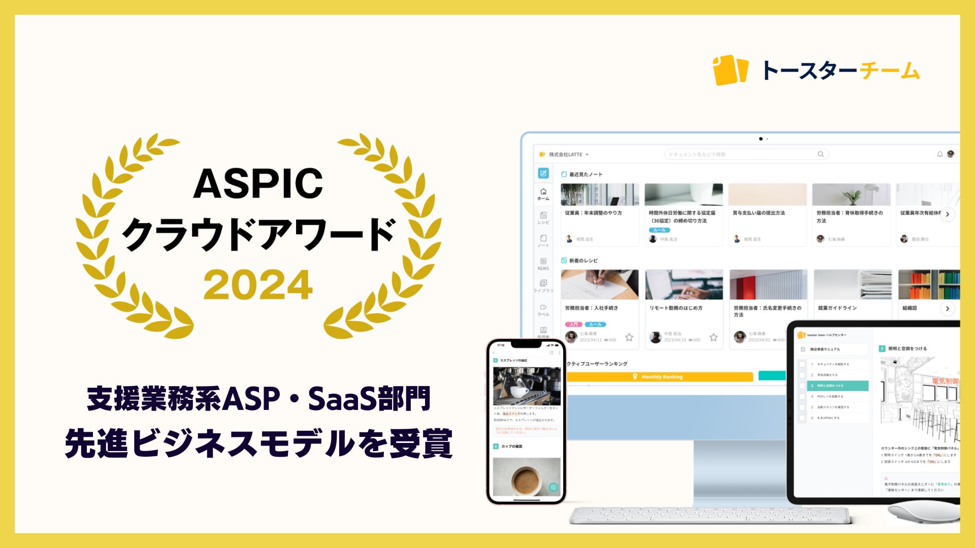 noco株式会社(本社:東京都中央区、代表取締役:堀辺憲)が提供するAIマニュアル作成ツール「トースターチーム」が、第18回「ASPICクラウドアワード2024」(主催:一般社団法人日本クラウド産業協会(略称:ASPIC、東京都品川区、会長:河合輝欣))において、支援業務系ASP・SaaS部門で「先進ビジネスモデル賞」を受賞いたしました。