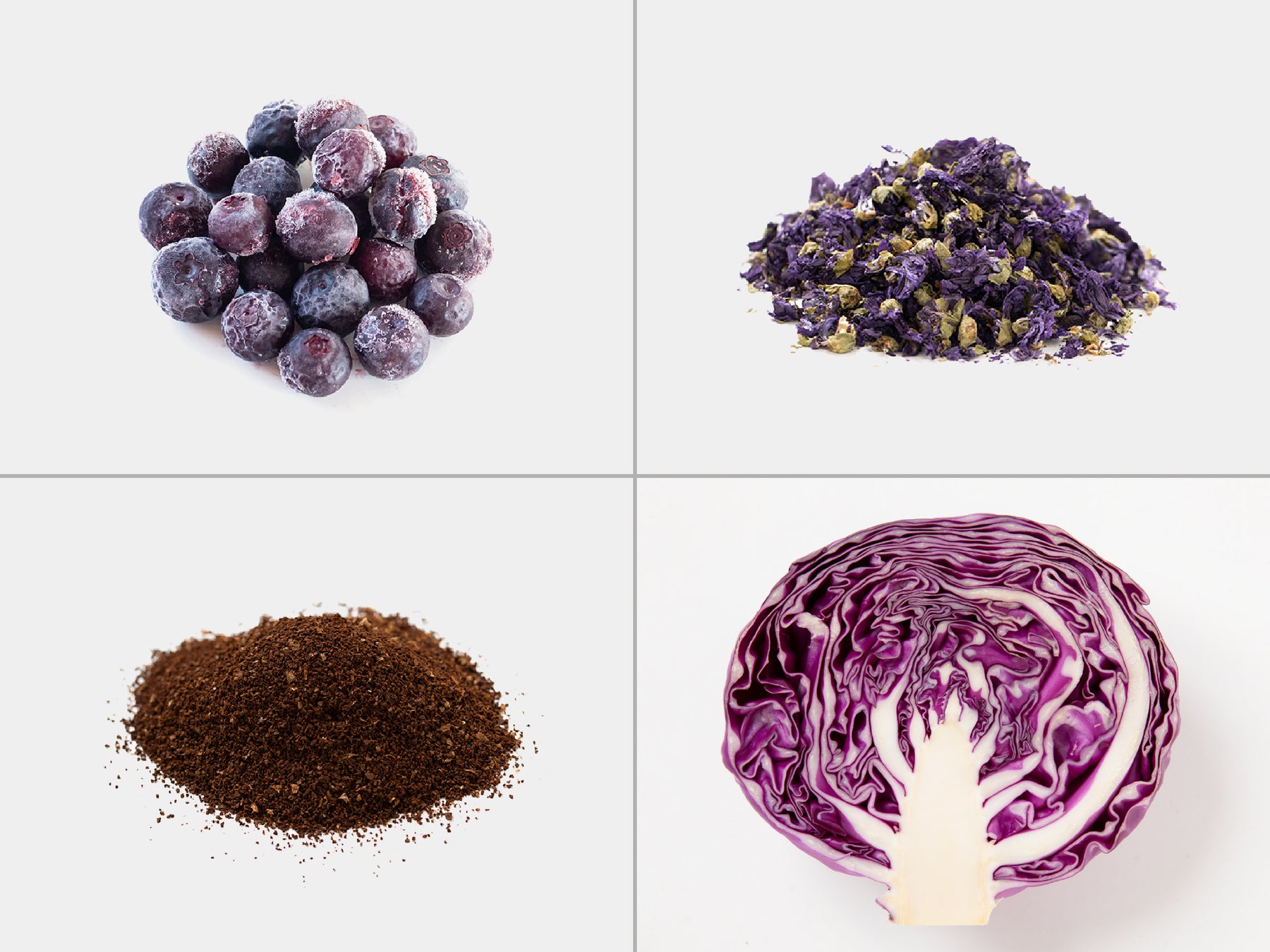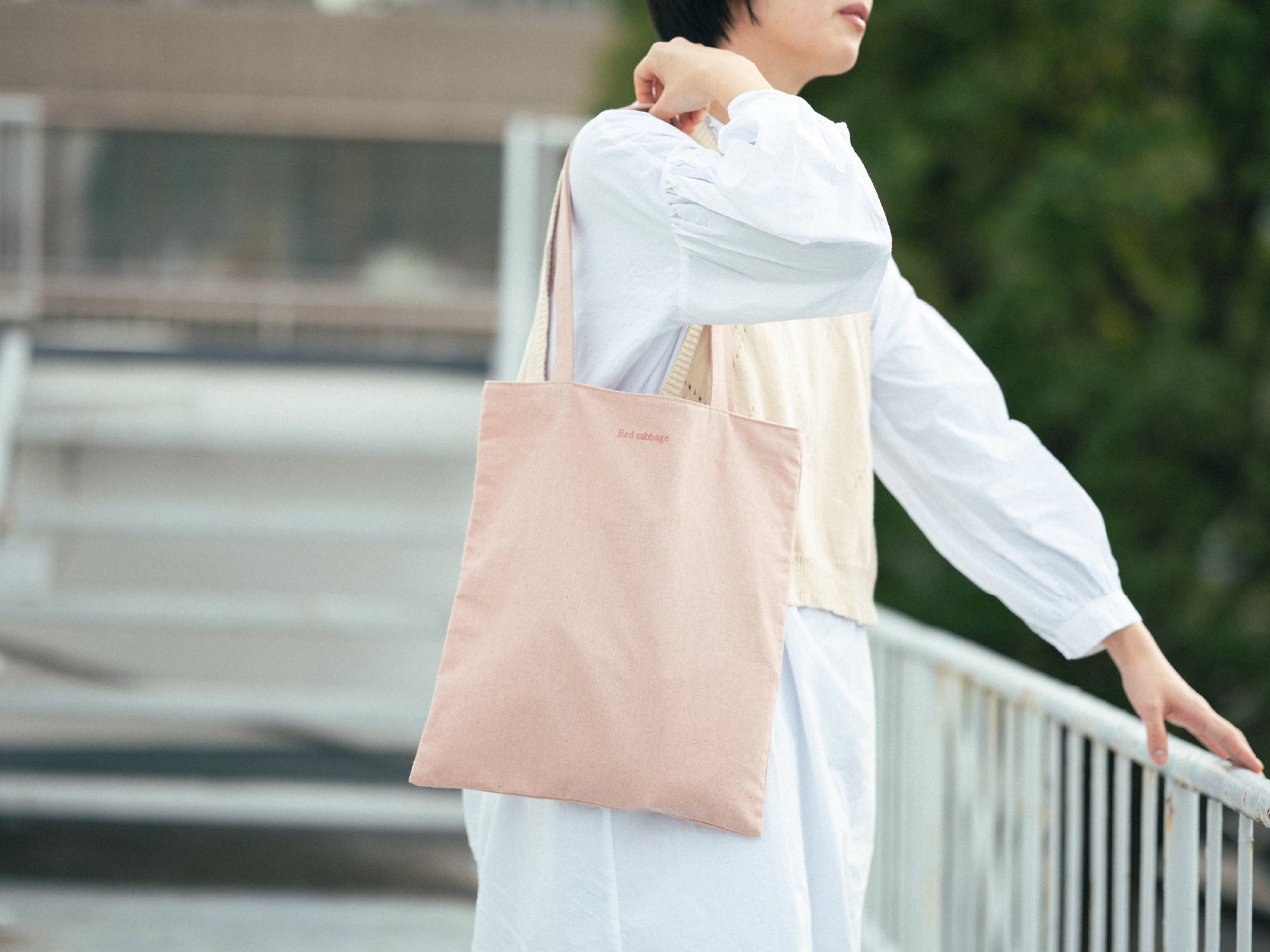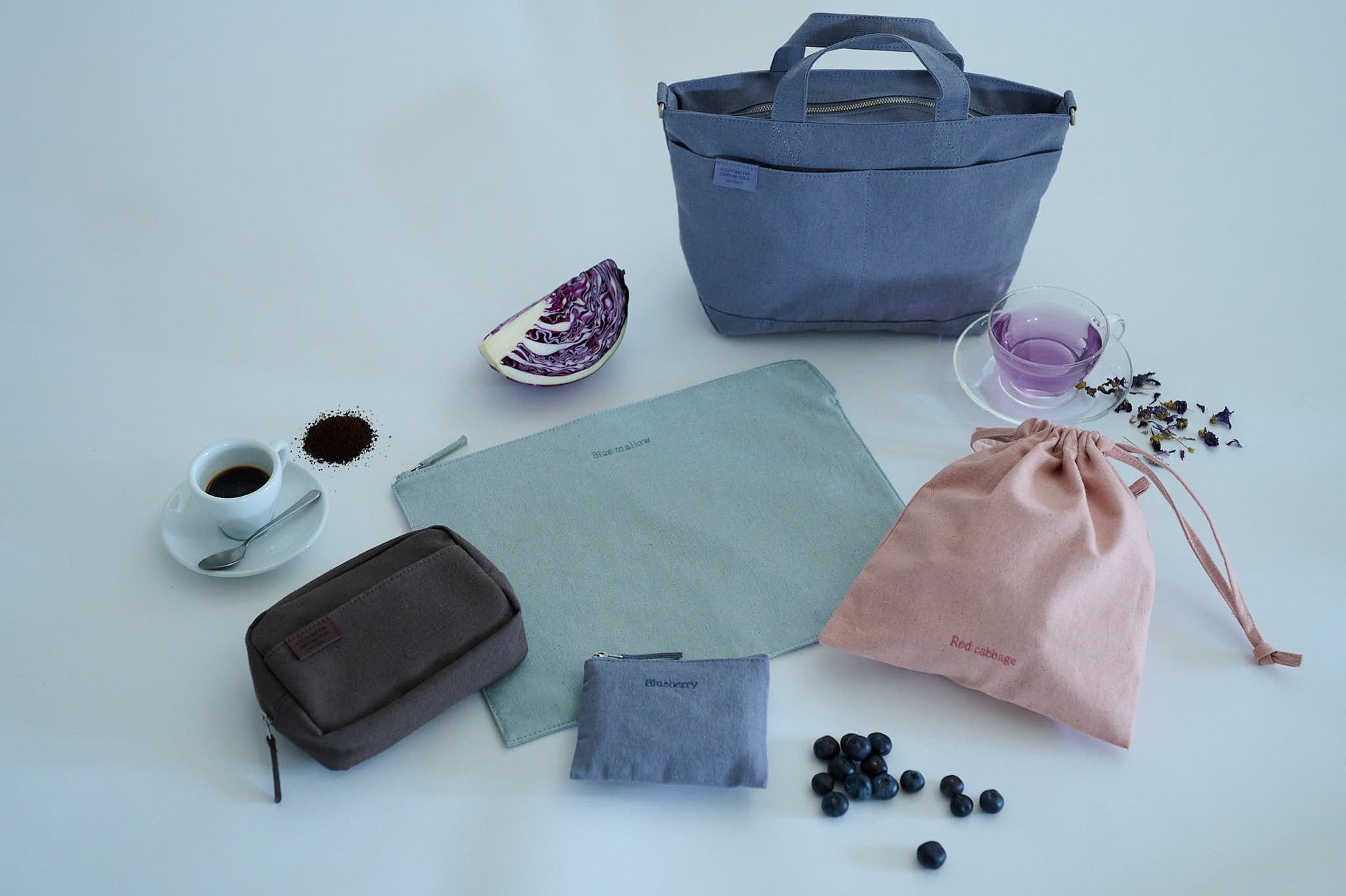 カラーは各アイテム、赤キャベツのピンク、ブルーベリーのライトパープル、ブルーマロウのミント、エスプレッソコーヒーのダークブラウンの4色展開。それぞれ元となった食材名をさりげなく刺繍で施しました。好みの食材から選んだカラーでアイテムを揃えるのもおすすめです。