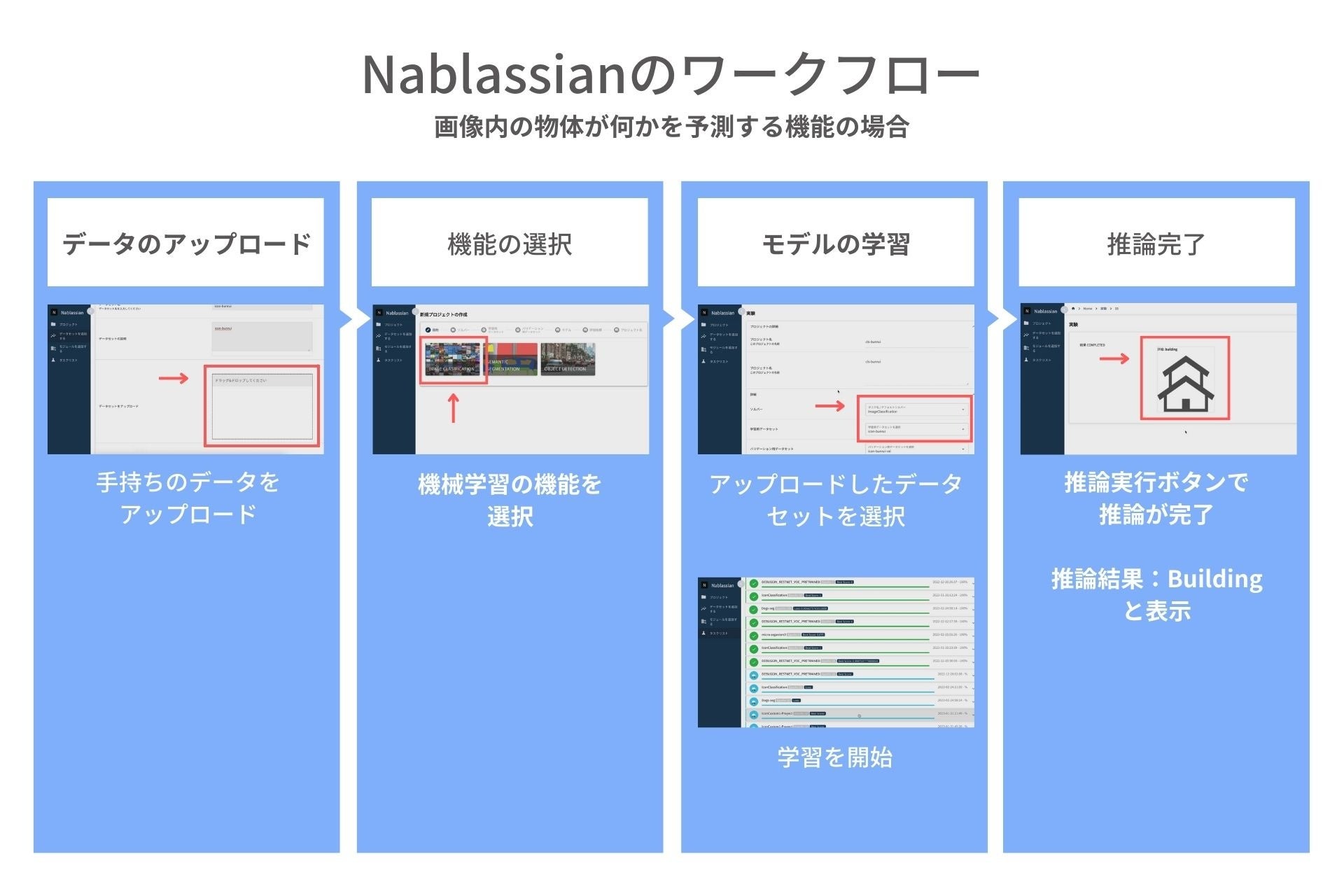「 Nablassian」はAIの専門知識不要で、誰でも簡単に操作をすることが可能です。基本的なワークフローはデータのアップロード、実行したい機能の選択、アップロードしたデータでモデルを学習、 機能の実行の4ステップです。