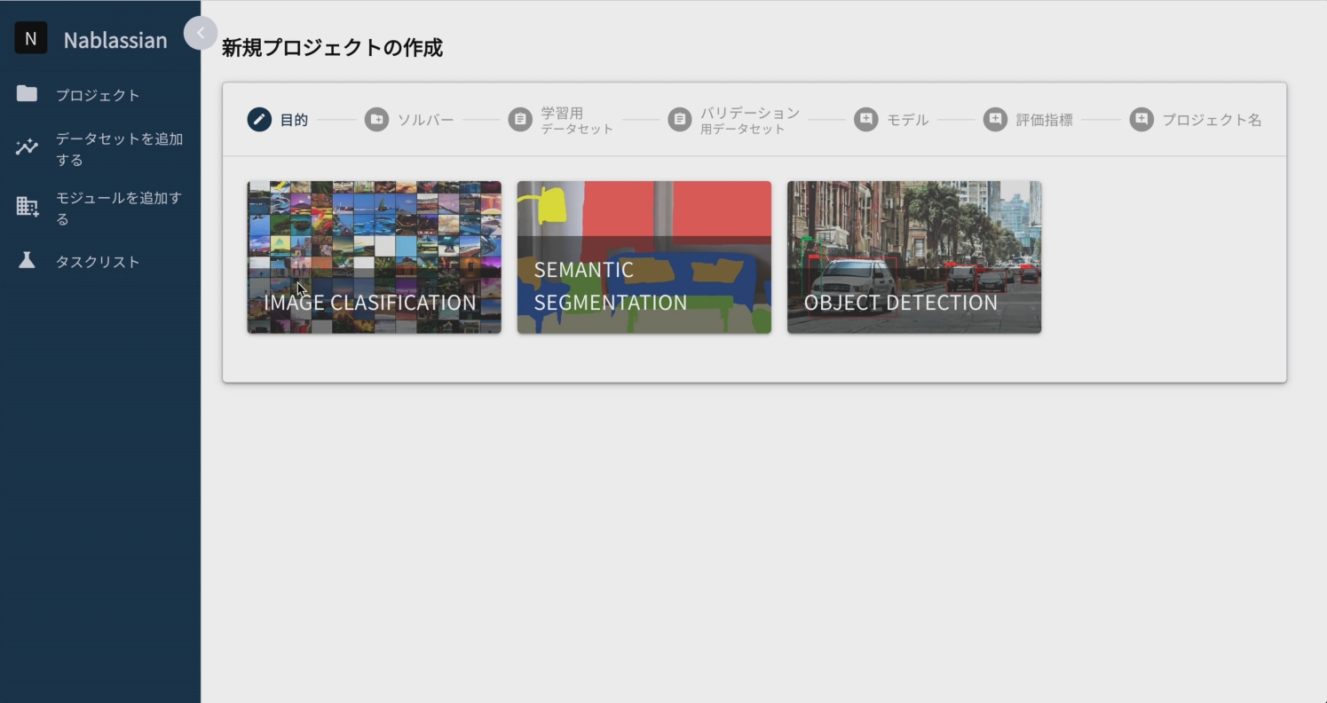 「Nablassian」では、物体検出・画像分類・セマンティックセグメンテーションの3つが基本タスクとして用意されており、目的に合わせて機能を選択することができます。また、上記3つ以外の機能もスピーディーに追加可能で、高いカスタマイズ性を持っています。