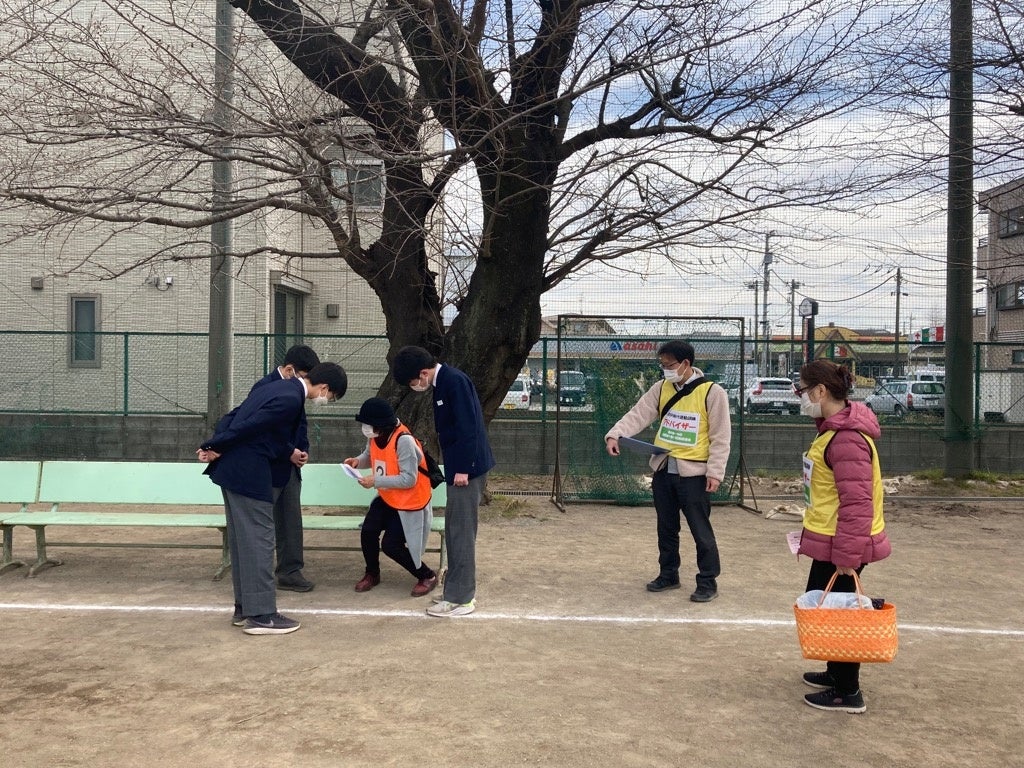 ⼀⽅で、認知症⾼齢者役などのために集まった⼤⼈は50⼈。「地域の⼦どもたちが声をかけてくれると、駅やお店の名前など地域の地図を頭に思い浮かべながら、⼿がかりを探そうとしてくれることがわかった。⾃分たちが住んでいる地区に⾒守りの⽬が増えることが⼼強い。」と、体験後の⽣徒の感想や変化に喜んでいました。卒業しても、藤沢地区の⼀員であることに変わりはありません。地域を⽀える⼀員として勇気と思いやりをもって「⾒守り」、「声かけ」することの⼤切さを学んでいました。