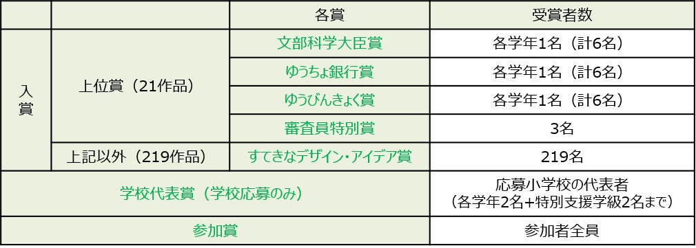 2024年11月27日(水)に東京都内で最終審査会を実施し、応募作品の中から、一次審査で選ばれた優秀作品(240点)の最終審査を行い、「文部科学大臣賞」、「ゆうちょ銀行賞」、「ゆうびんきょく賞」(各6名)、「審査員特別賞」(3名)、「すてきなデザイン・アイデア賞」(219名)の受賞者を決定いたしました。