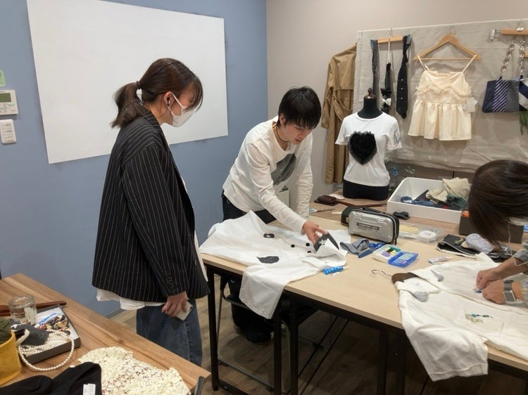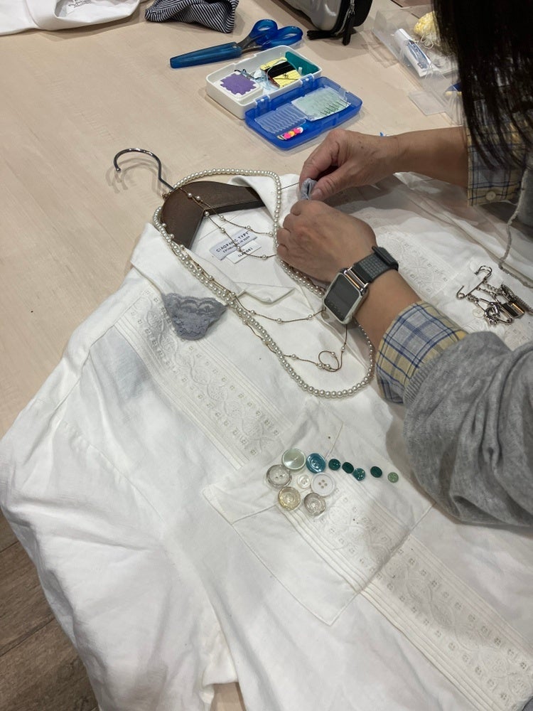 「お客様が店内のボタンやレースを楽しそうに選びながら、思い思いに古着をアレンジされている姿がとても印象的でした。針を使わずボンドで制作できる点も好評で、全員がオリジナルの一着を完成させることができました。」