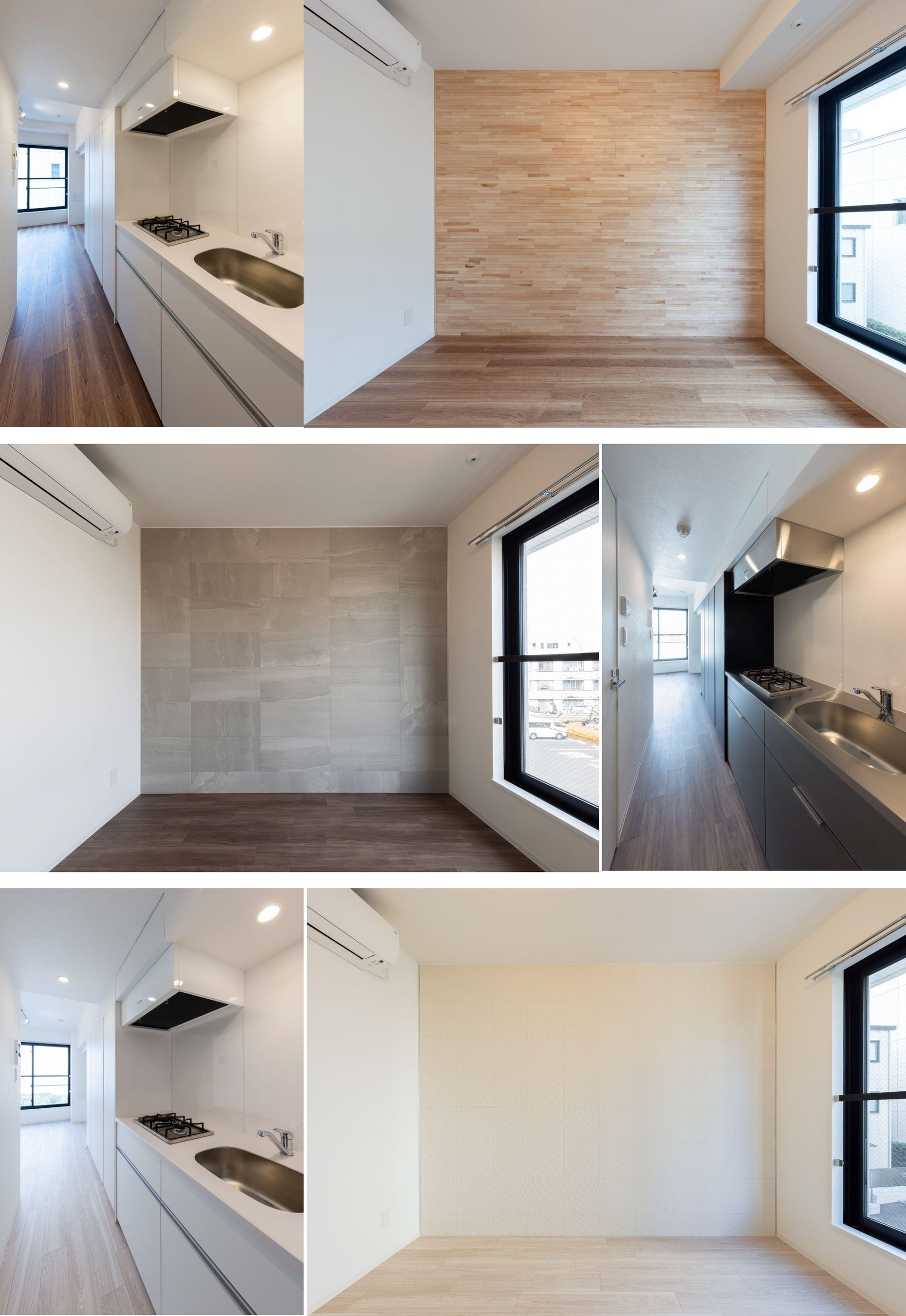 専有部内は、コンパクトな空間にキッチン、クローゼット、設備配管を壁側に集約させたシンプルかつ機能的で合理的なプランニングを行い、そこにニュートラルな色彩をそえる3つの内装パターンでデザインしています。1F・4Fはインダストリアル調をテーマとし大判の砂岩調グレータイルを設置、2F・5Fは木質感をテーマとし木素材を使用したアクセントパネルを設置、3F・6Fは北欧をテーマとし幾何学的なレリーフが特徴のホワイトタイルを設置し、それぞれの居室が魅力を持つことで持続的に求められる空間としています。