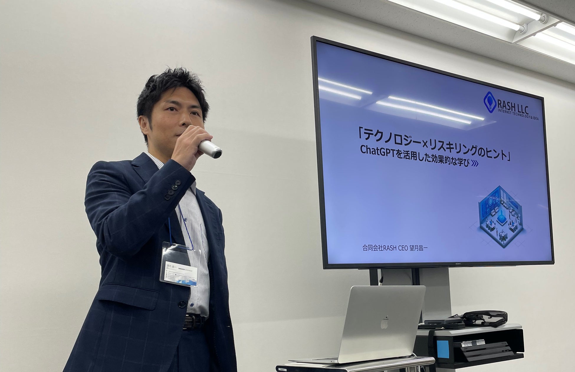 具体的なChatGPTを活用したリスキリングの実例や、どのような内容まで現在利用が可能になっているのかといった具体例の紹介、事業展開するための導入ステップなどを詳しく紹介し、強力な学習・業務支援ツールとなるGPT利用を推奨した。