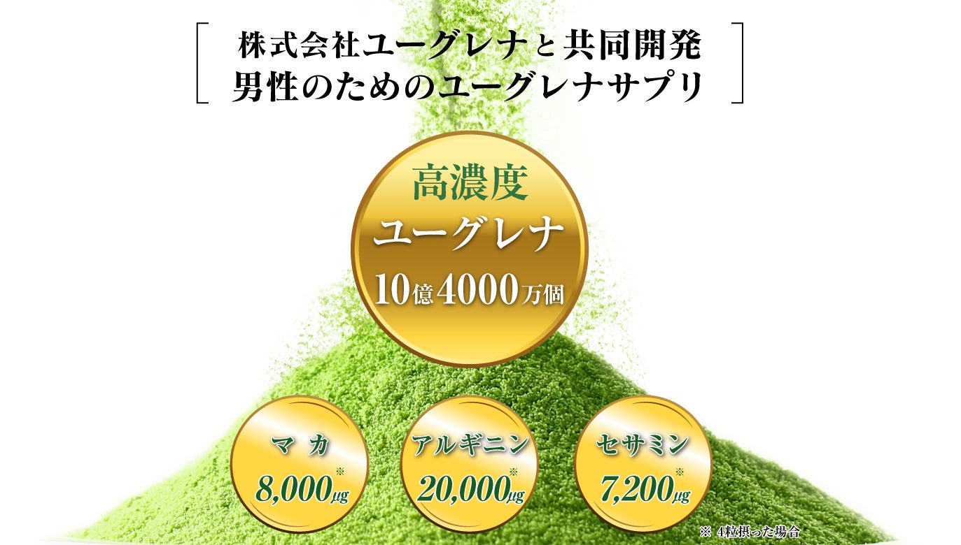 ビタミン、ミネラル、アミノ酸、不飽和脂肪酸など、59種類もの栄養素を持つユーグレナをたっぷりと高濃度に配合、さらに、マカ、アルギニン、セサミンという男性の活力をサポートする3種類の成分を配合。日々の体のコンディションづくりをしっかりとサポートし、加齢による悩みをケア。いくつになっても元気に楽しむ毎日へ。