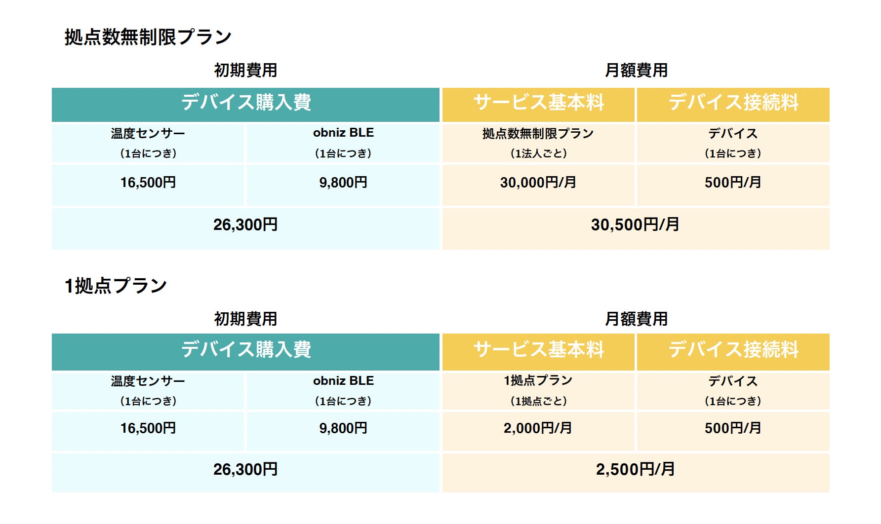 クラウドを活用した先進のobnizゲートウェイや、Bluetooth®やWi-Fi回線を活用した各種センサーを使用することで、初期費用のデバイス購入費を最小構成の2万円台と抑えることができます。さらに多店舗のチェーン展開をする企業でも、サービス固定費が月額3万円、デバイス接続料が月額500円(1台あたり)と低コストで導入できます。