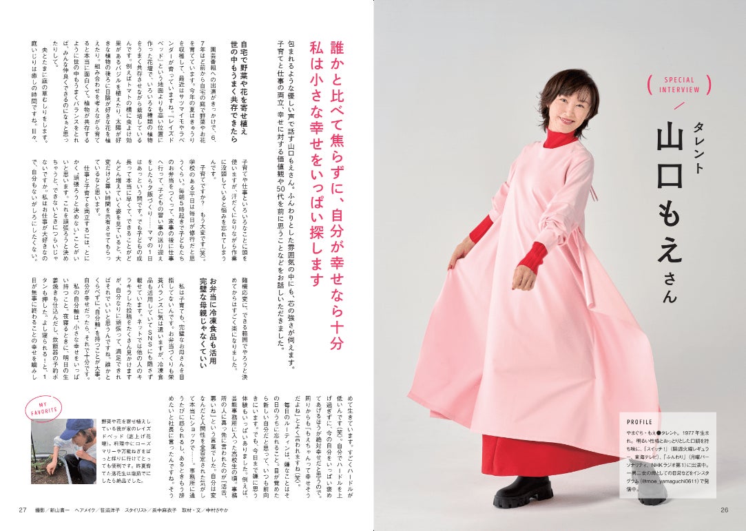 そこで10月号では更年期を大特集。女性だけでなく、パートナーや家族など更年期に関わる人々全員で更年期を乗り切るための知識や体験談をご紹介します。表紙にはタレントの山口もえ一さんが登場!いつでもにこやかな山口さんに年齢への向き合い方や機嫌よく過ごすための考え方などを伺いました。