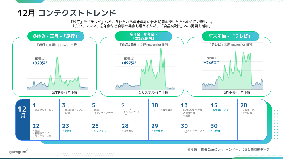 12月は、『冬休み - 旅行』『忘年会・新年会 - 食品&飲料』『年末年始 - テレビ』が注目トレンド