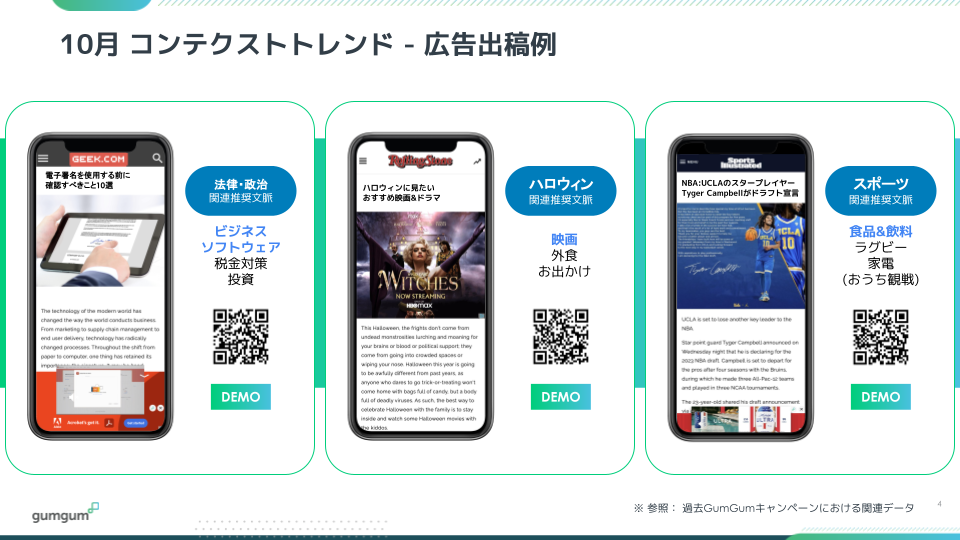 GumGumは画像と言語を解析するコンテクスト解析技術(MRC認証技術*)を使用して、Webコンテンツの文脈を内容に基づいて分類**することができます。たとえば、ラグビーワールドカップ前後には「スポーツ」関連文脈のコンテンツが増えるなど、文脈ごとのコンテンツの数はシーズンやイベントの影響により毎月変動します。GumGumではこれを文脈のトレンドとして捉え、毎月のトレンドを予測・公開しており、これらのトレンドに合わせて広告を出稿することによって広告効果(CTRなど)を向上できることが確認されています(自社調べ***)。
