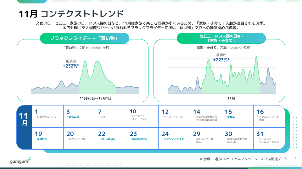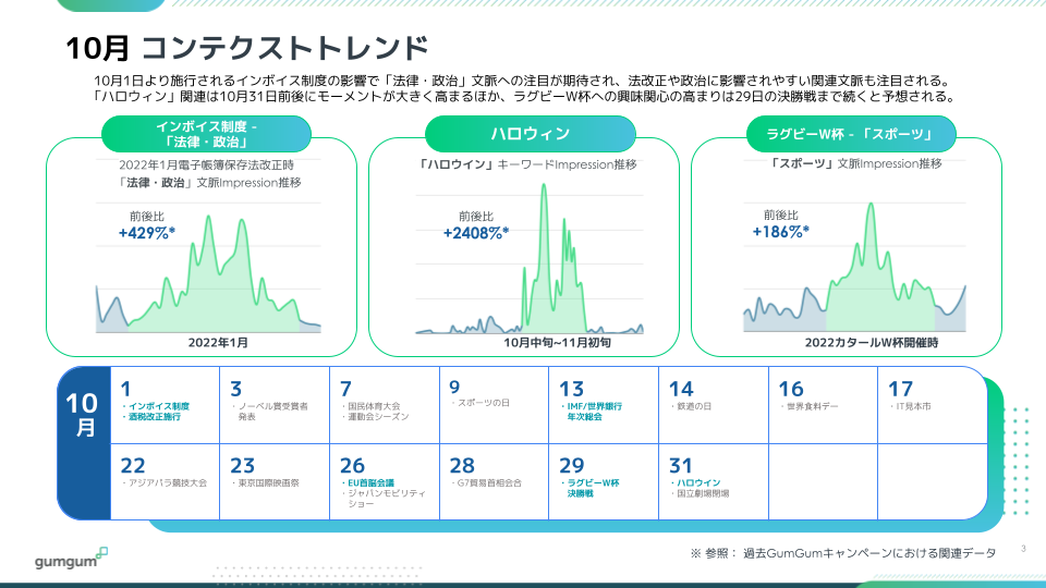 「インボイス制度開始」や「クリスマス」など、2023年の秋から冬の文脈トレンドを分析した”コンテクストカレンダー10月-12月版”を公開【コンテクスチュアル広告のGumGum】
