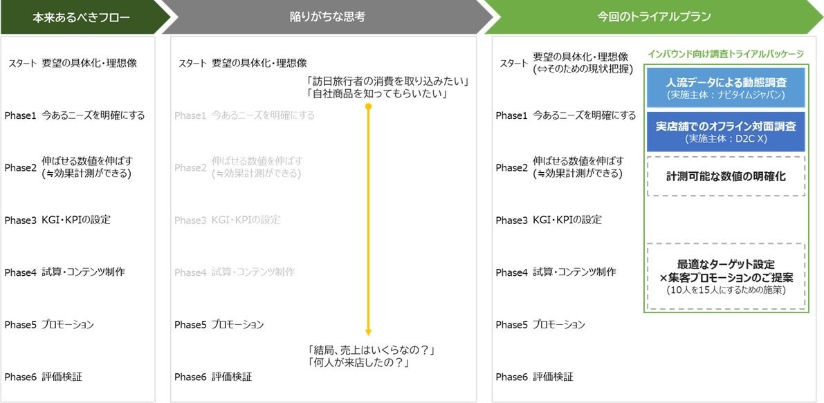 これらの課題を解決すべく、訪日外国人マーケットに特化したマーケティングを展開する「D2C X」が、ナビタイムジャパンのインバウンドGPSデータを活用し、インバウンド強化を目指す企業様を対象にした『インバウンド向け調査トライアルパッケージ』の提供に至りました。