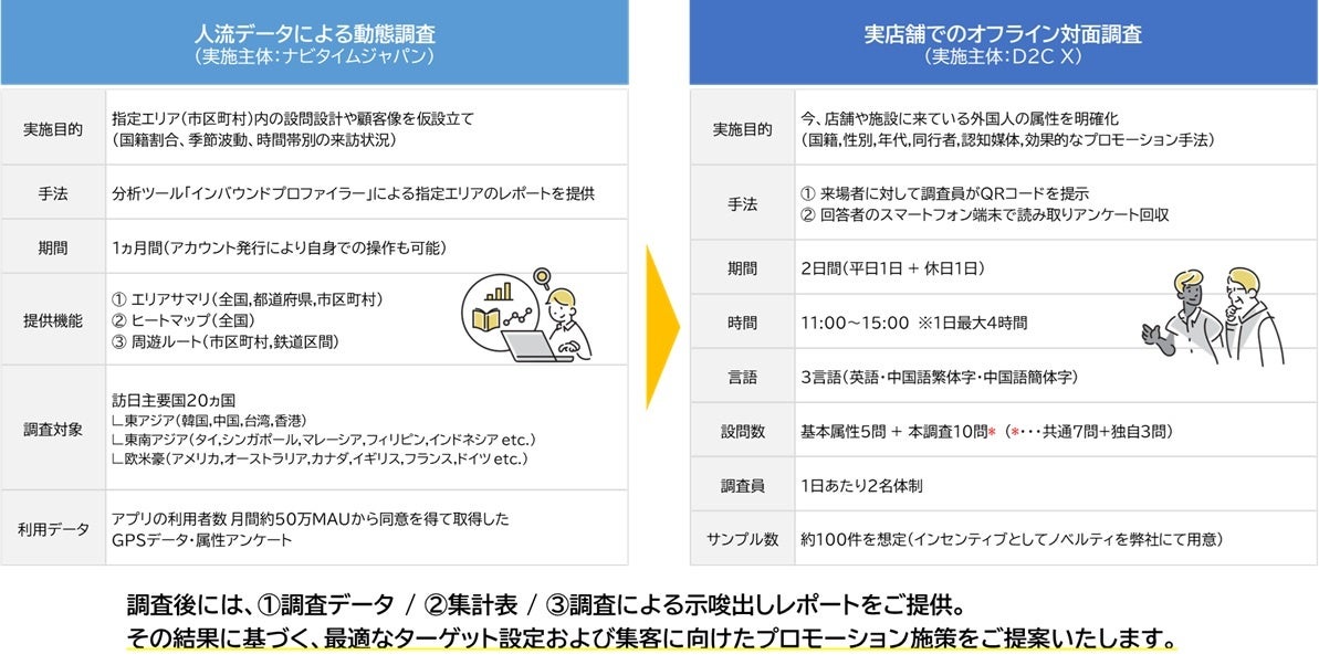 本サービスは、ナビタイムジャパンが保有する訪日外国人のGPSに基づく人流データによる動態調査と、D2C Xが実施する実店舗でのオフライン対面調査を一体化したD2C X独自のパッケージです。訪日外国人をターゲットにした施策を検討する際の仮説構築や、現在来訪している外国人の属性を明確にします。