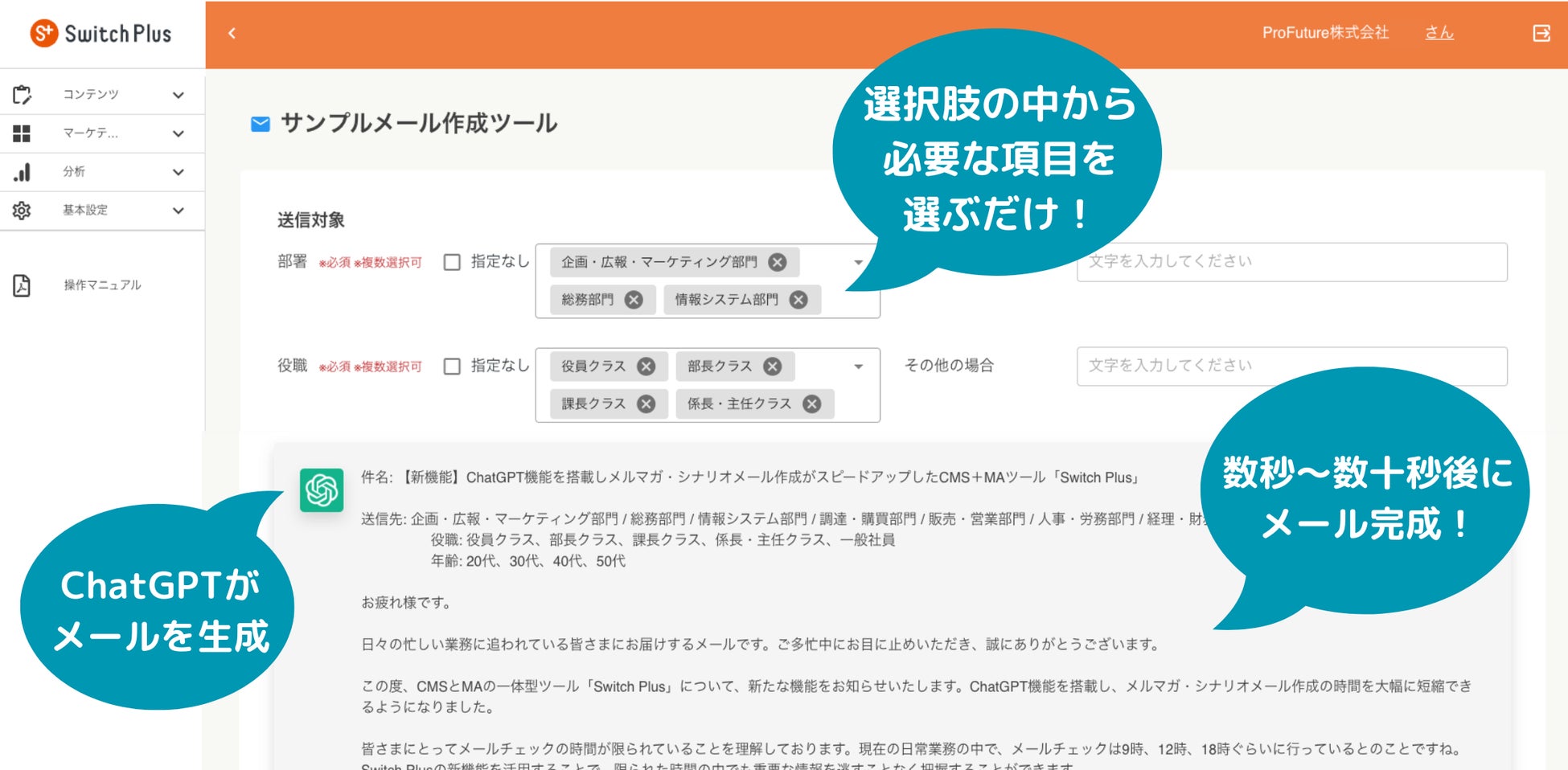 BtoBマーケティング支援を行うProFuture株式会社(本社:東京都千代田区、代表取締役社長:寺澤 康介)は、自社サービスであるCMSとMAの一体型ツール「Switch Plus(スイッチ プラス)」において、ChatGPTと連携した新機能を搭載したことをお知らせいたします。ChatGPT機能との連携により、マーケティング関連のメールを作成する時間が大幅に短縮できるようになり、業務の効率化が期待できます。