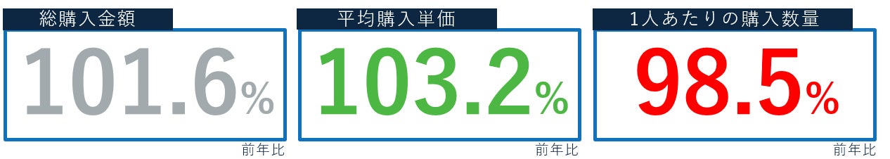 カタリナネットワーク内で買い物をした消費者の2024年の総購入金額は、2023年と比較し1.6%増加しました。総購入金額増加の要因は平均購入単価の上昇で、前年比103.2%と3.2%増加しました。平均購入単価は値上げの影響で上昇していますが、 2022年と比較をしている2023年消費者購買行動変化レポートと比較すると上昇率は和らいでいます(※参考:2022-2023年比較参照) 。一方、1人あたりの購入数量は前年比98.5%と1.5%減少しています。1人あたりの購入数量は減少していますが、2023年消費者購買行動変化レポートと比較すると減少率は小さくなりました(※参考:2022-2023年比較参照) 。値上げの傾向が続いているため平均購入単価は増加していますが、昨年と比較すると1人あたりの購入数量の減少幅は小さくなり、買い控えの動きが少し弱まっていると考えられます。
