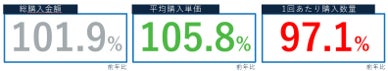 1回あたりの購入金額を見てみると62.9円(前年比102.4%)増加していますが、1回あたり購入数量(買い物かごに入れる数)は0.1個(前年比99.3%)微減しています。1商品あたりの平均購入単価は、7.8円(前年比103.2%)上昇しています。