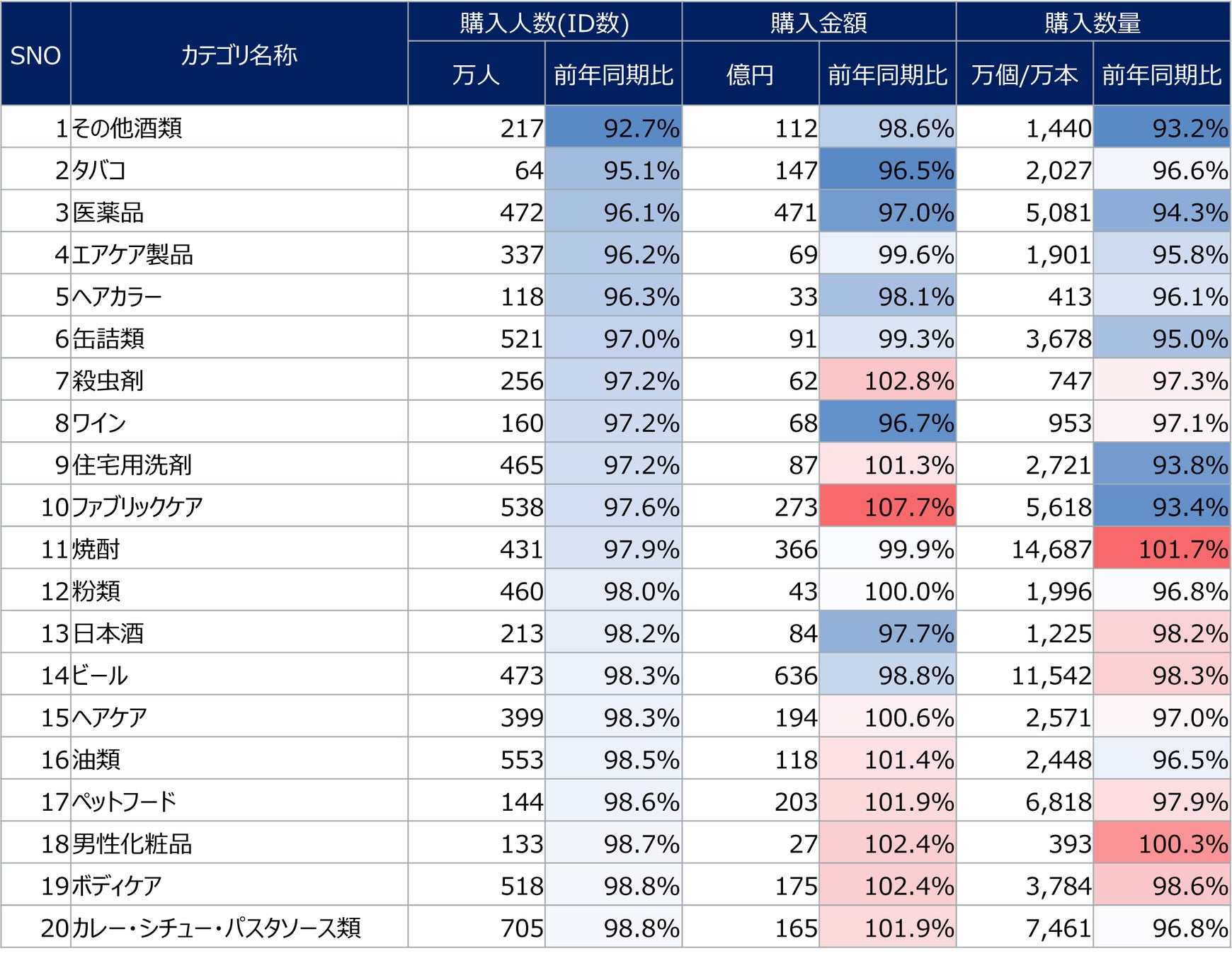購買状況をカテゴリ別で見てみます。以下の表は各カテゴリの購入状況を示したもので、前年と比較した際に、購入人数(ID数)の減少率が大きかった順に20位までを並べたものです。購入人数(ID数)は今回分析対象とした全46カテゴリのうち実に43カテゴリ(93.5%)で前年を割っています。