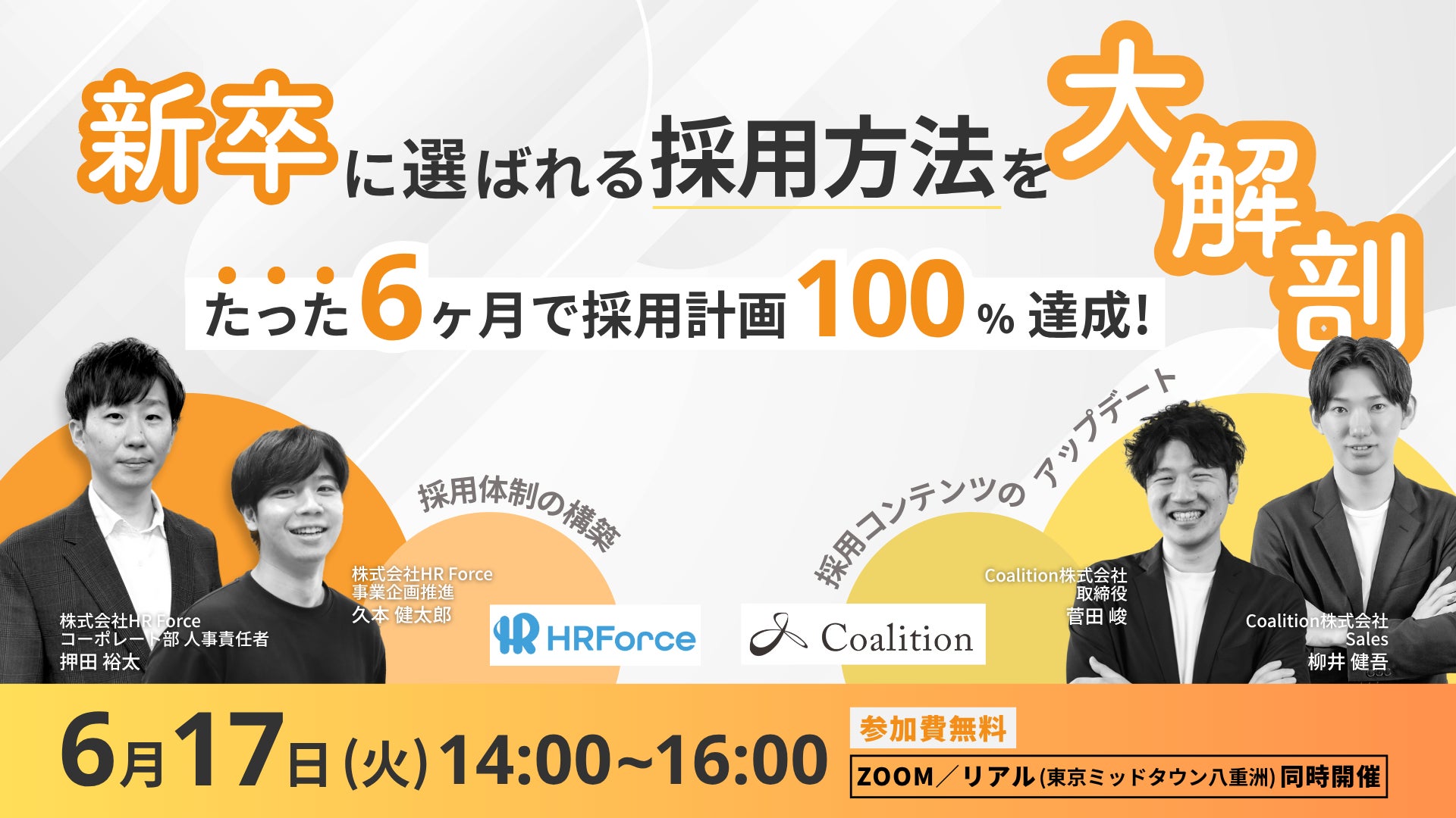 株式会社HR Force(本社:東京都中央区、代表取締役社長:村田 泰子、以下HR Force)とCoalition株式会社(本社:東京都目黒区、代表取締役社長:高橋 慧、以下Coalition)は2025年6月17日(火)「新卒に選ばれる採用方法を大解剖~たった6ヶ月で採用計画100%達成!~」セミナーを開催することをお知らせします。