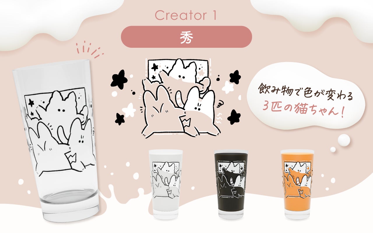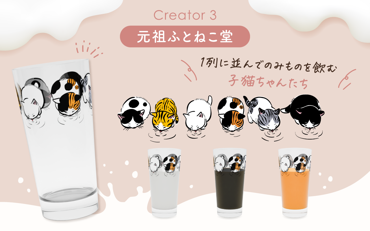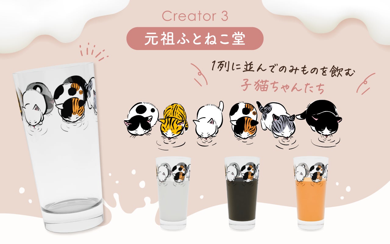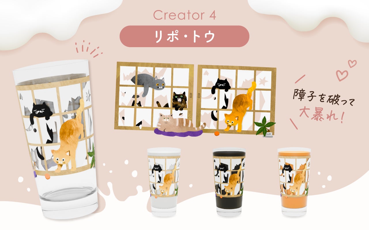 オリジナルグッズ作成・販売サービス「SUZURI byGMOペパボ」の人気クリエイター4名とコラボレーションした、今回だけのオリジナルデザインの「キャットカップ」ロンググラス 4種類を予約販売します。