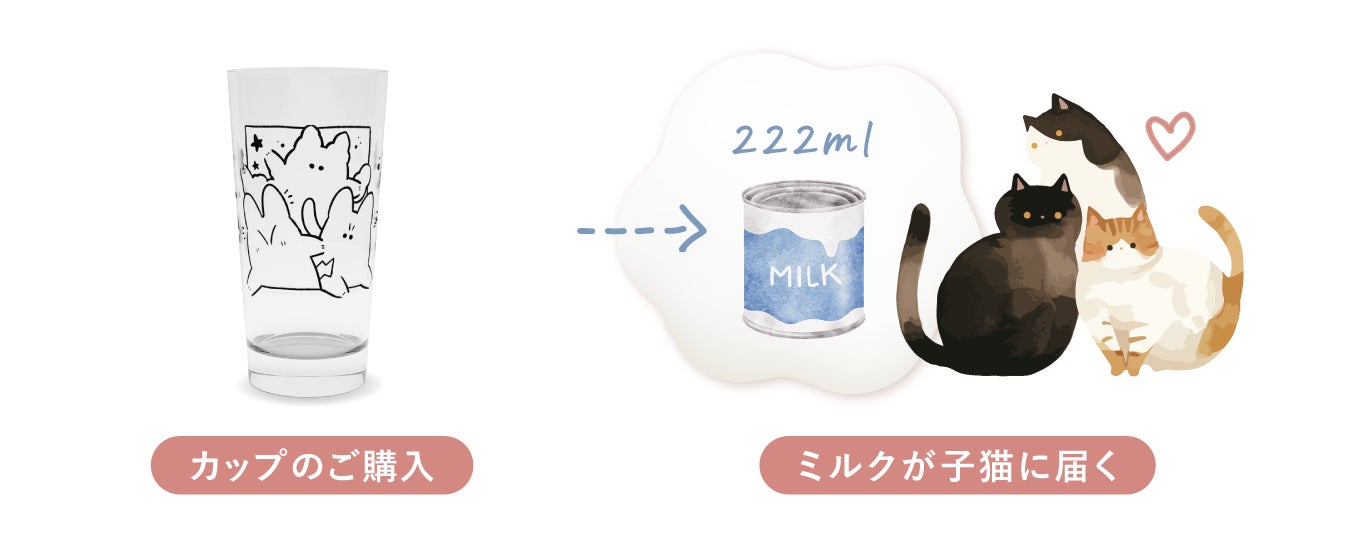 カップの販売個数に応じて、カップ1個につき、222ml(にゃんにゃんにゃん)の子猫用のミルクを、全国の保護猫活動を行う動物福祉団体に寄付します。また、ミルクを必要とする団体さまの募集も行います。