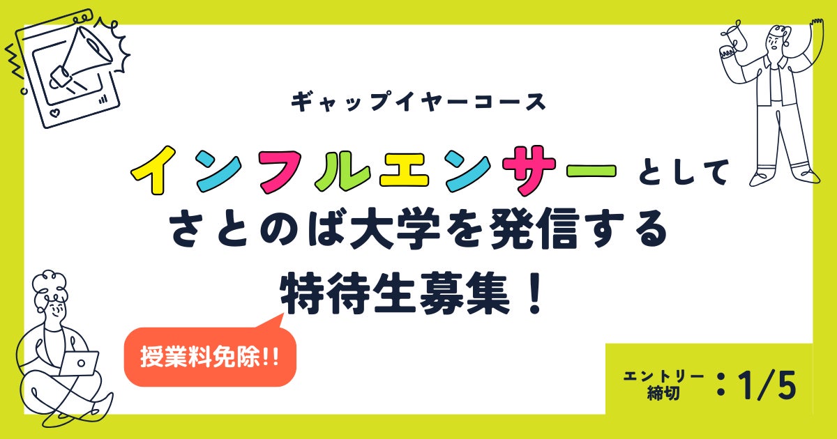 株式会社アスノオト(所在地:東京都千代田区、代表取締役:信岡 良亮)が運営する「さとのば大学」では、2025年度ギャップイヤーコース生として連携地域に留学し、自身の暮らしやプロジェクト実践から得られる学びを広く発信するインフルエンサーを、特待生(授業料全額免除)として1名募集いたします。