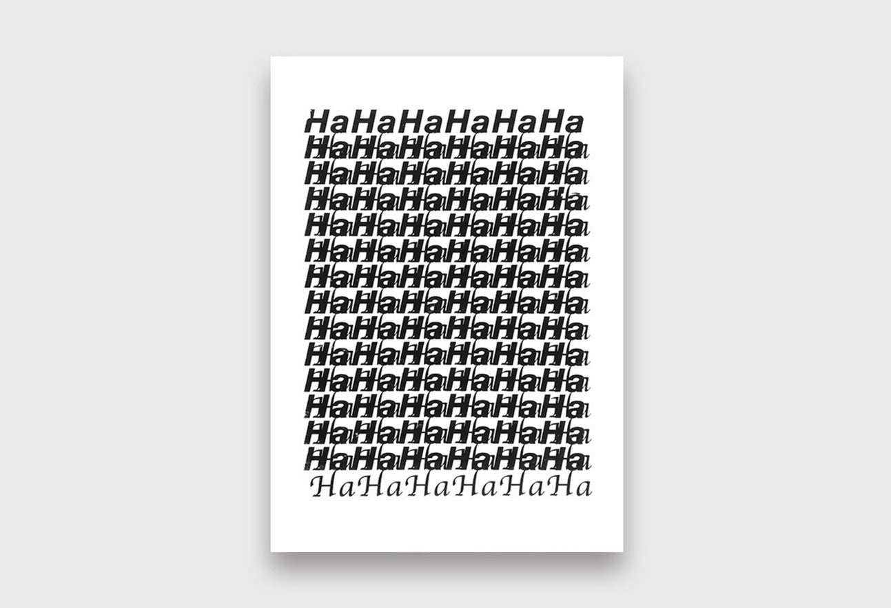 異なるフォントの文字が、シルクスクリーンによって重なり合う様子は、笑い声が重なっているようなイメージをも浮かび上がらせ、魅惑的な仕上がりになっています。