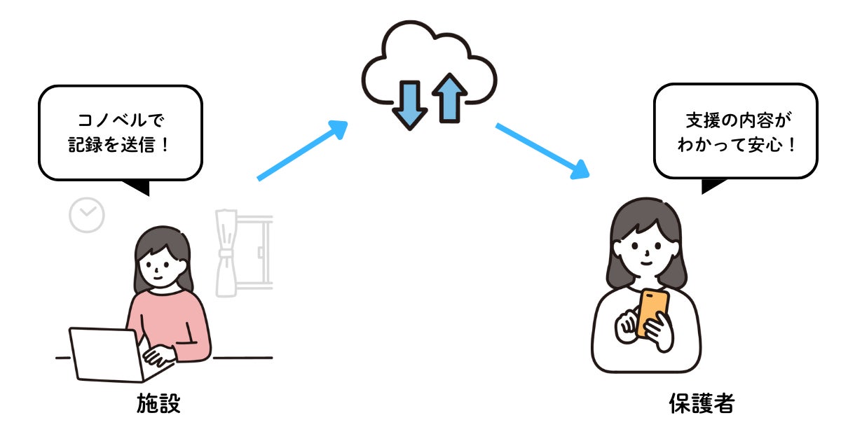 「コノベル」は、利用者情報管理を中心に、職員と保護者の連絡手段のデジタル化や職員の働き方改革に寄与する低価格なクラウドサービスです。