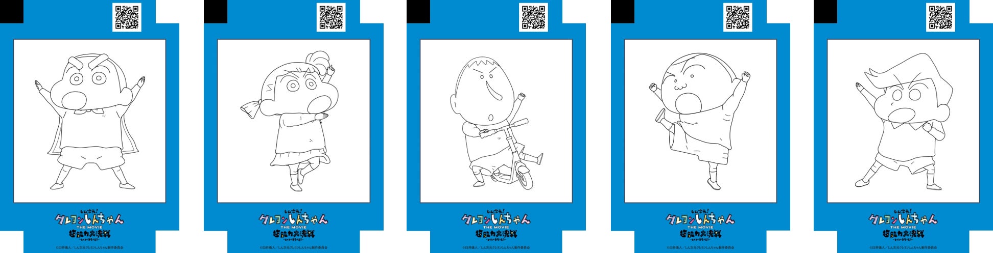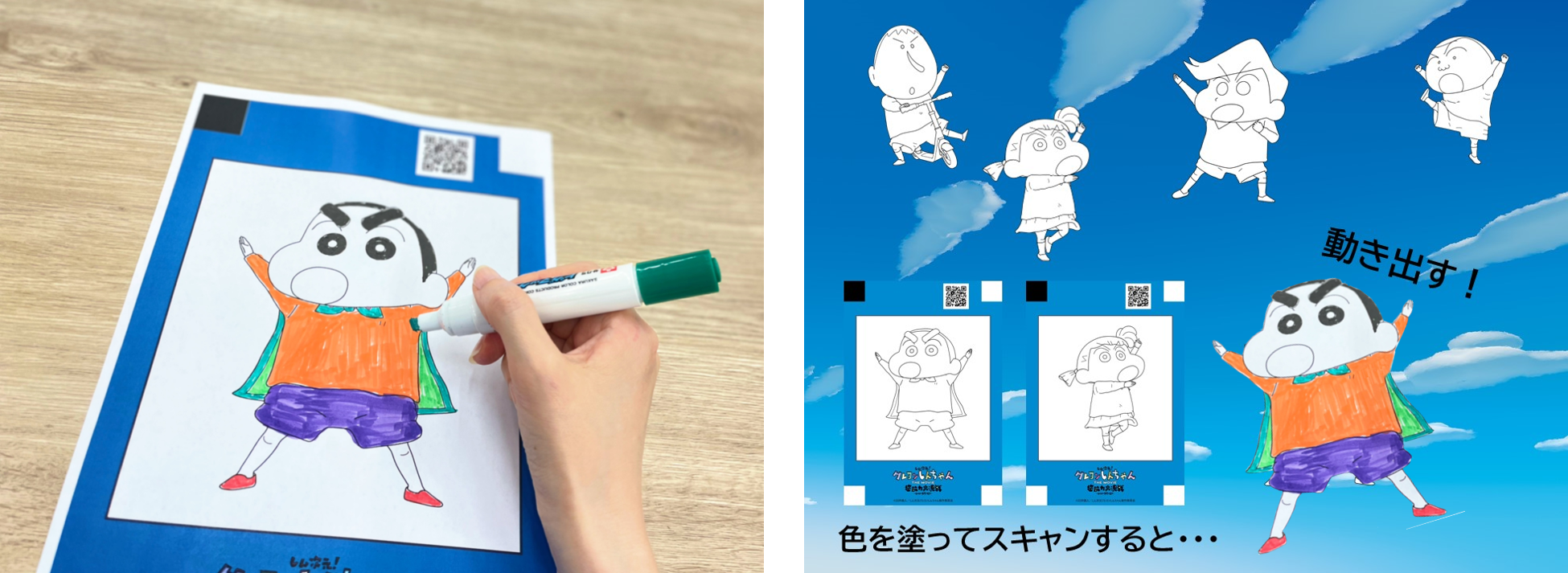 『しん次元! クレヨンしんちゃん THE MOVIE 超能力大決戦 〜とべとべ手巻き寿司〜』に登場するキャラクターのぬりえに色を塗ってスキャンすると、大画面で動き出します。動き方は投影されてからのお楽しみ。
