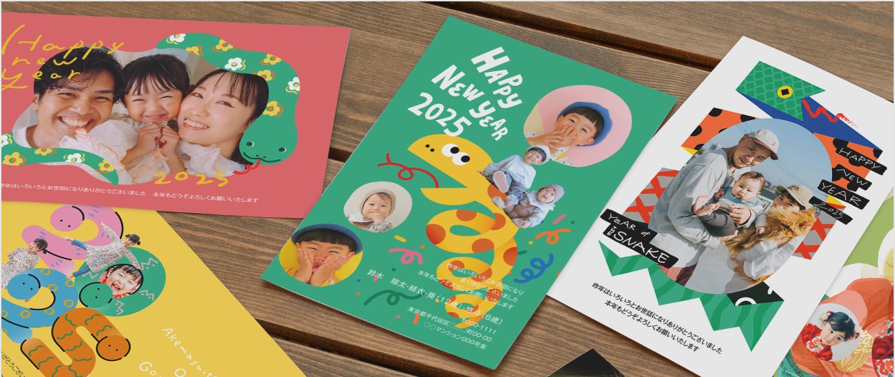 「つむぐ年賀2025」では、定番から個性派まで新作のデザインテンプレートを約150点追加し全1,000種類のラインナップとなりました。中でも今年は干支である「ヘビ」のデザインにこだわり、誰でも使いやすいヘビのデザイン素材を多数取り揃えました。
