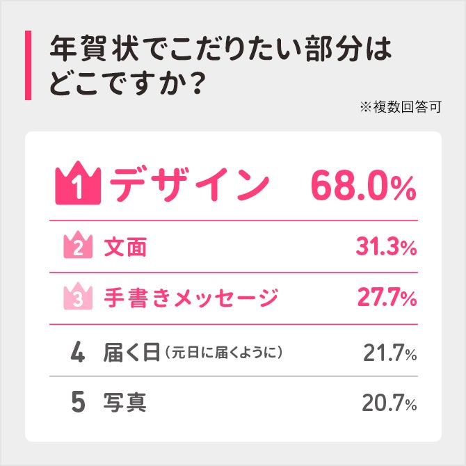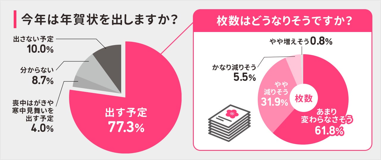 郵便料金値上げの影響で今年は年賀状離れが加速するともいわれていますが、ソルトワークスの一般向け調査(※1)では、今年も年賀状を出す予定かを尋ねたところ、77.3%の方が「今年も出す予定」と回答、「今年は出さない予定」と回答した人は10.0%にとどまりました。枚数がどうなるかの質問に対しては、61.8%は「変わらなさそう」と回答し、「やや減りそう」「かなり減りそう」と回答した人を合わせると37.4%となりました。郵便料金値上げによって一人当たりの出す枚数は少なくなるものの、すぐに年賀状をやめる理由にはならないようです。
