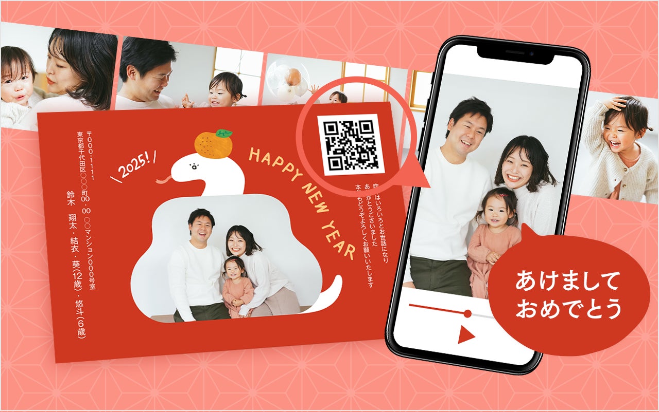 アプリ内に収録されているデザイン素材以外にも、自身の文字や絵をスタンプ化させたり(手書きスタンプ機能)、人物写真を自動で切り抜いたり(マイスタンプ機能)すれば、オリジナリティがさらにアップ。さらに、動画を二次元コード化させてスタンプとしてデザイン面に載せることも可能です。年賀状を受け取った相手がコードを読み込めば、動画メッセージが再生されて、サプライズ感も演出できます。