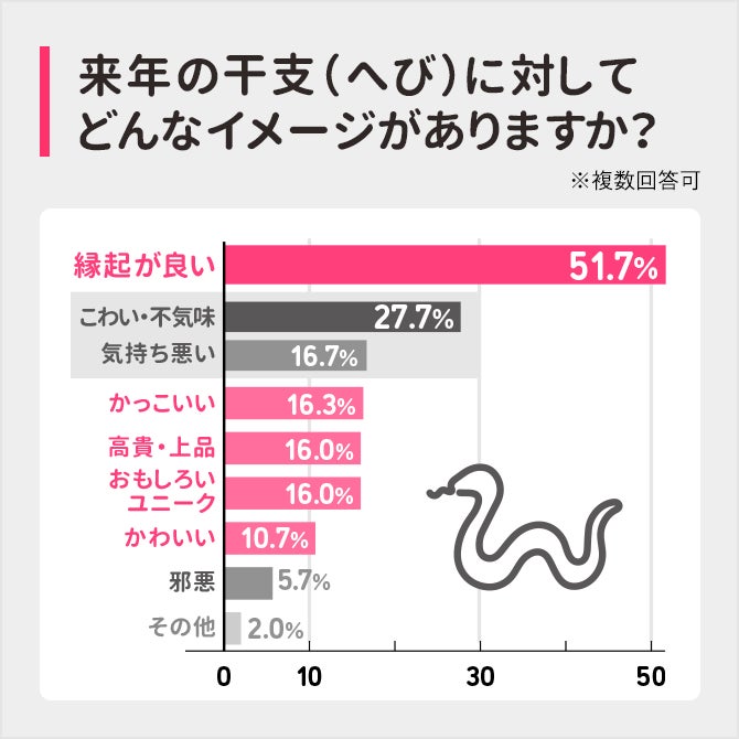 ソルトワークスが2024年9月に行ったアンケート調査(※1)では、9割以上の人が年賀状のデザインに干支のイラストや写真を入れると回答。年賀状に干支はマストな存在であるといえます。しかし、来年の干支ヘビに対してのイメージは、約半数の51.7%が「縁起が良い」と回答する一方で、「かっこいい」「高貴・上品」といったプラスイメージをおさえて「こわい」「気持ち悪い」といったマイナスイメージを持つ人が多いことがわかりました。これらの結果を踏まえ、「つむぐ年賀」ではヘビが苦手な方でも選びやすいテンプレートやスタンプ素材を充実させました。