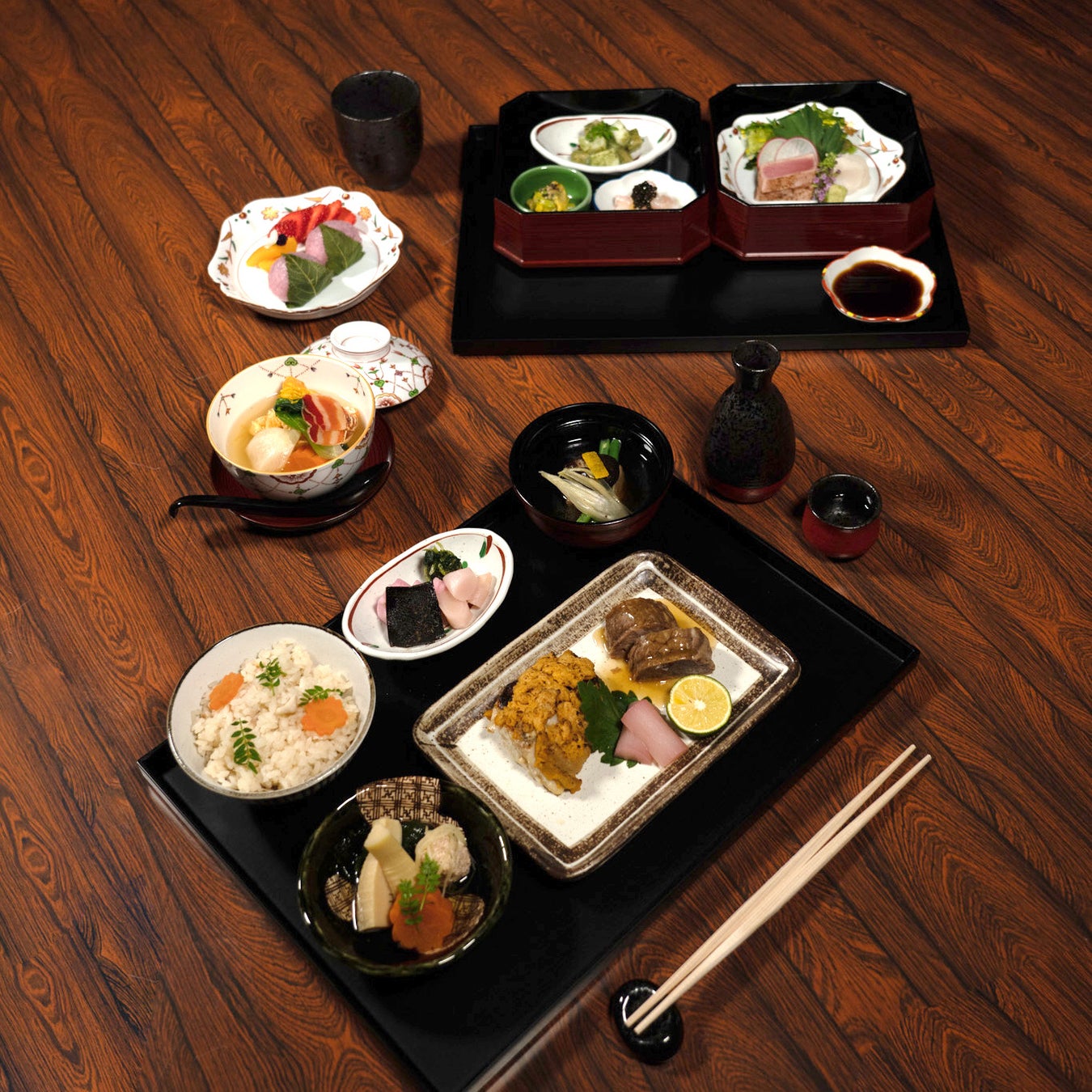 京懐石の夕食は、先付を特製の二段弁当でお召し上がりいただきます。向付も鮮やかな磁器の器に盛られています。メインコースは、香の物、蓋物、台の物、強肴、ご飯、留椀から成ります。最後に、水菓子が繊細な磁器の花皿に盛られ、懐石料理の体験が締めくくられます。