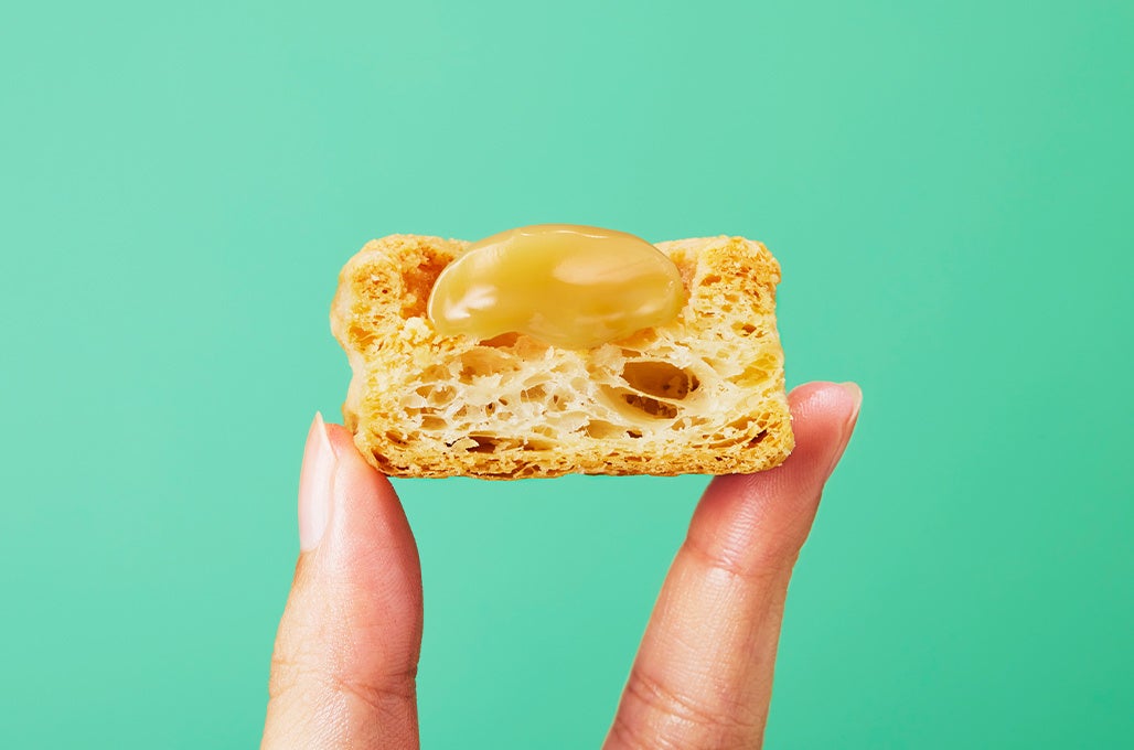 512層に折り込まれたパイ生地に北海道十勝産のパルメザンチーズパウダーをひと振りして焼き上げました。チーズの香るパイ生地の中央にはバターを作る過程で生まれる副産物であるバターミルクパウダーとチェダーチーズパウダーを加えたチーズクリームを乗せました。