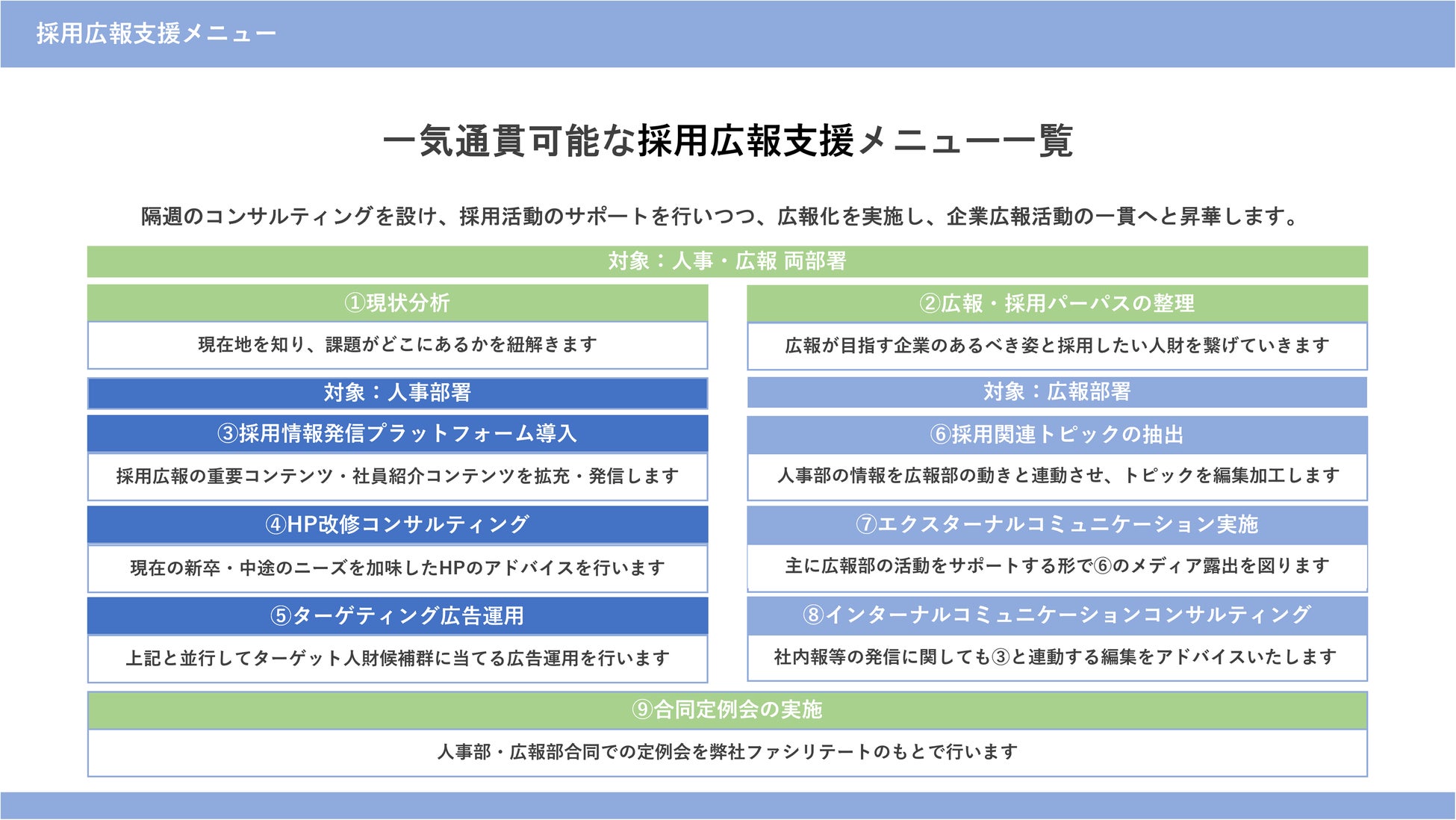 弊社ではそのような時代のニーズに対応するため、新たな採用活動の一環として、人事部が行う採用コミュニケーションと広報部が行う企業コミュニケーションを繋ぎ合わせ、企業の採用活動に特化した企業広報活動を進める広報サービスを提供いたします。