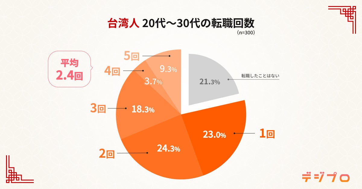 20代~30代の台湾人のうち、転職経験がある人は約79%で、転職回数の平均は2.4回という結果に。最も多いのは2回(24.3%)、次いで1回(23.0%)でした。この高い転職率は、台湾の若者がキャリアの向上を目指して積極的に行動していることわかります。
