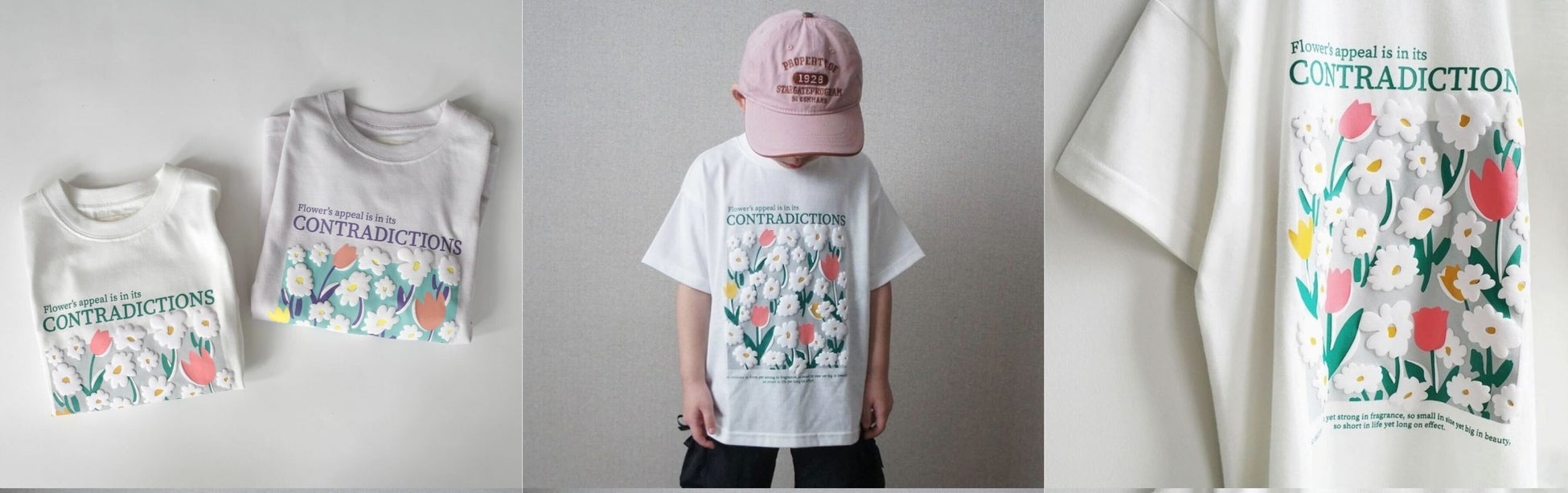アビティ定番「男の子も使える花柄」アイテム。ぷくっと立体感のある発泡プリントが触って楽しいポイント。暑い夏に大活躍の1着です。