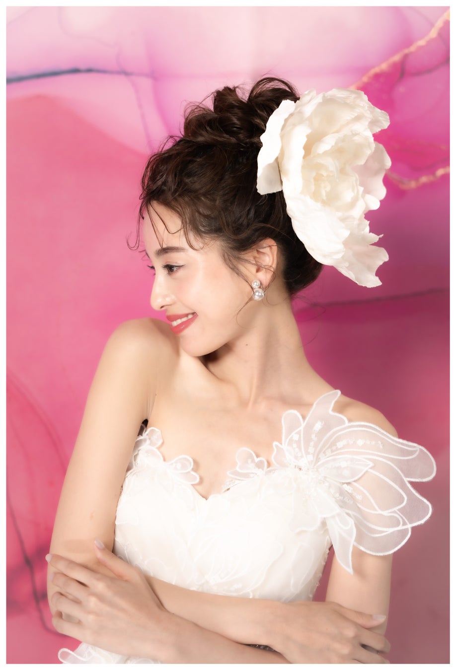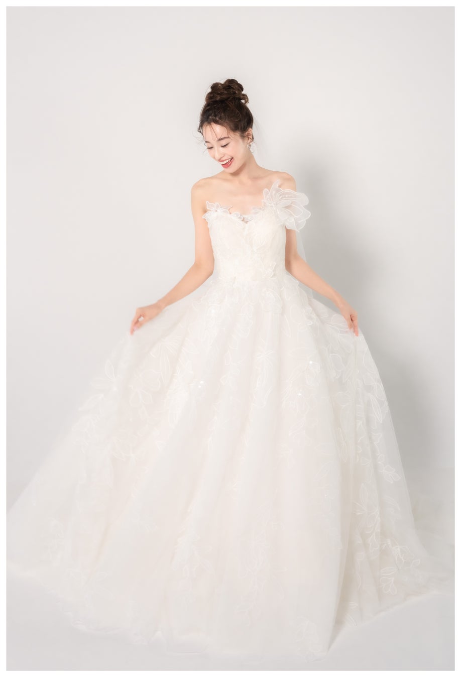 ヘアは、アップスタイルにするとより一層キュートに、ダウンスタイルにすると少し大人っぽく着こなしていただけます。