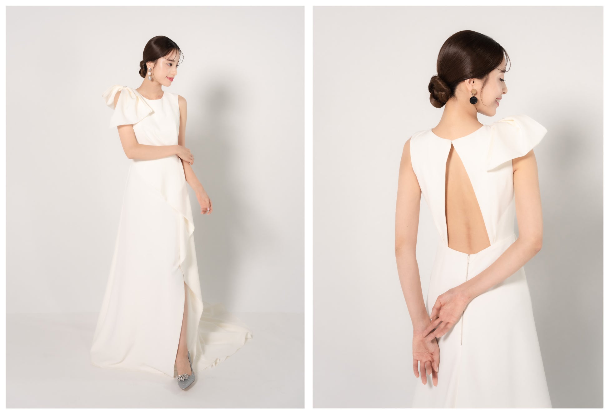光沢のないマットなシルク生地で、モードな表情に。カッティングが特徴的なバックスタイルや、シューズのチラ見せを楽しめるスリット、アシンメトリーなデザインなど、トレンド感も随所に散りばめられています。飾り過ぎないカジュアルな会場などにもぴったりです。