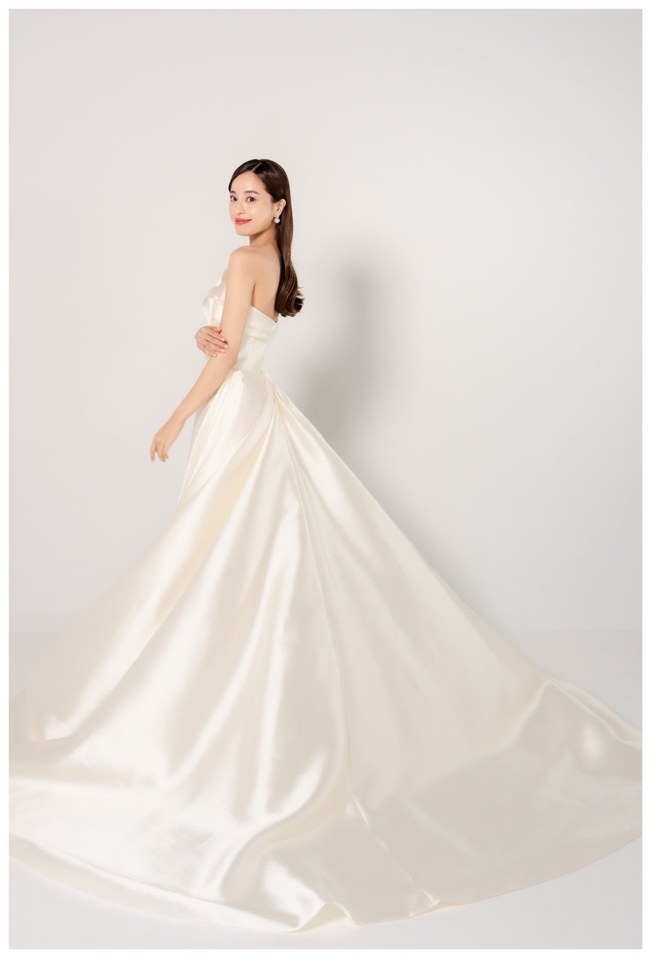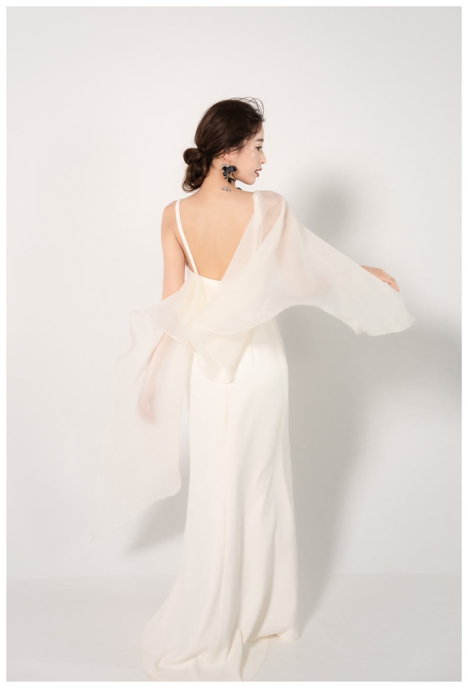 とろみのある軽やかなシルク素材のシンプルなドレス。風になびくオーガンジーをまとうことで、天女を思わせる神秘的な花嫁姿が叶います。