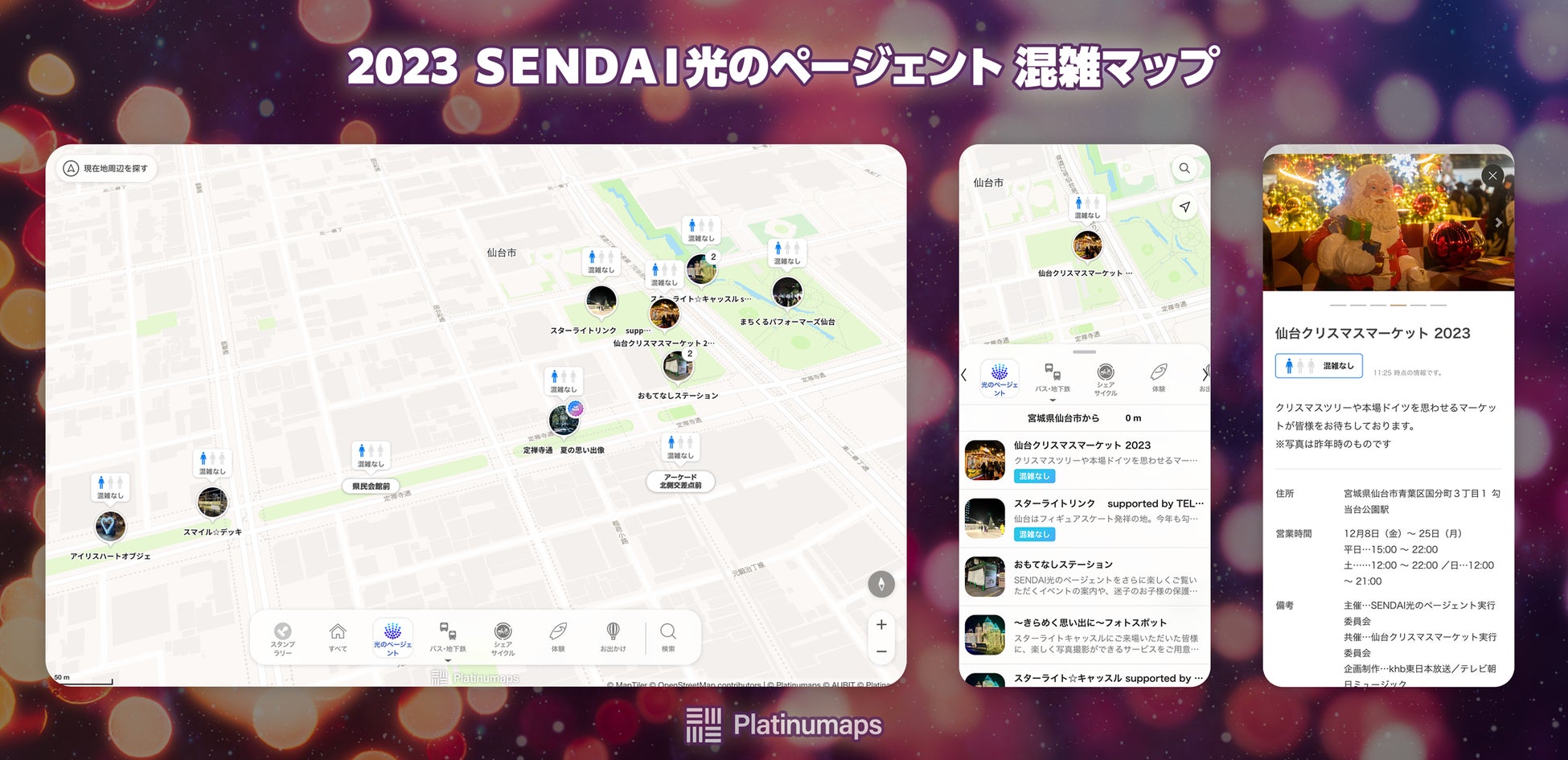 仙台市では、一般社団法人まちくる仙台、定禅寺通街づくり協議会、ゼロワ株式会社、東北大学データ駆動科学・AI教育研究センター(酒井正夫准教授)等関係者と連携のもと、中心市街地の約30ヵ所にセンサーを設置し、歩行者通行量等を可視化する取組を行っています。この一環として、仙台市街地のイルミネーションイベント「2023 SENDAI光のページェント」において、BLEセンサーから得られる通行量データ(人流データ)を、データ連携基盤FIWAREを通じて「仙台MaaS」デジタルマップへ連携することにより、来訪者がスマートフォンから会場内各地点の混雑度をリアルタイムに確認できるようにしました。実施期間は12月15日〜12月25日です。