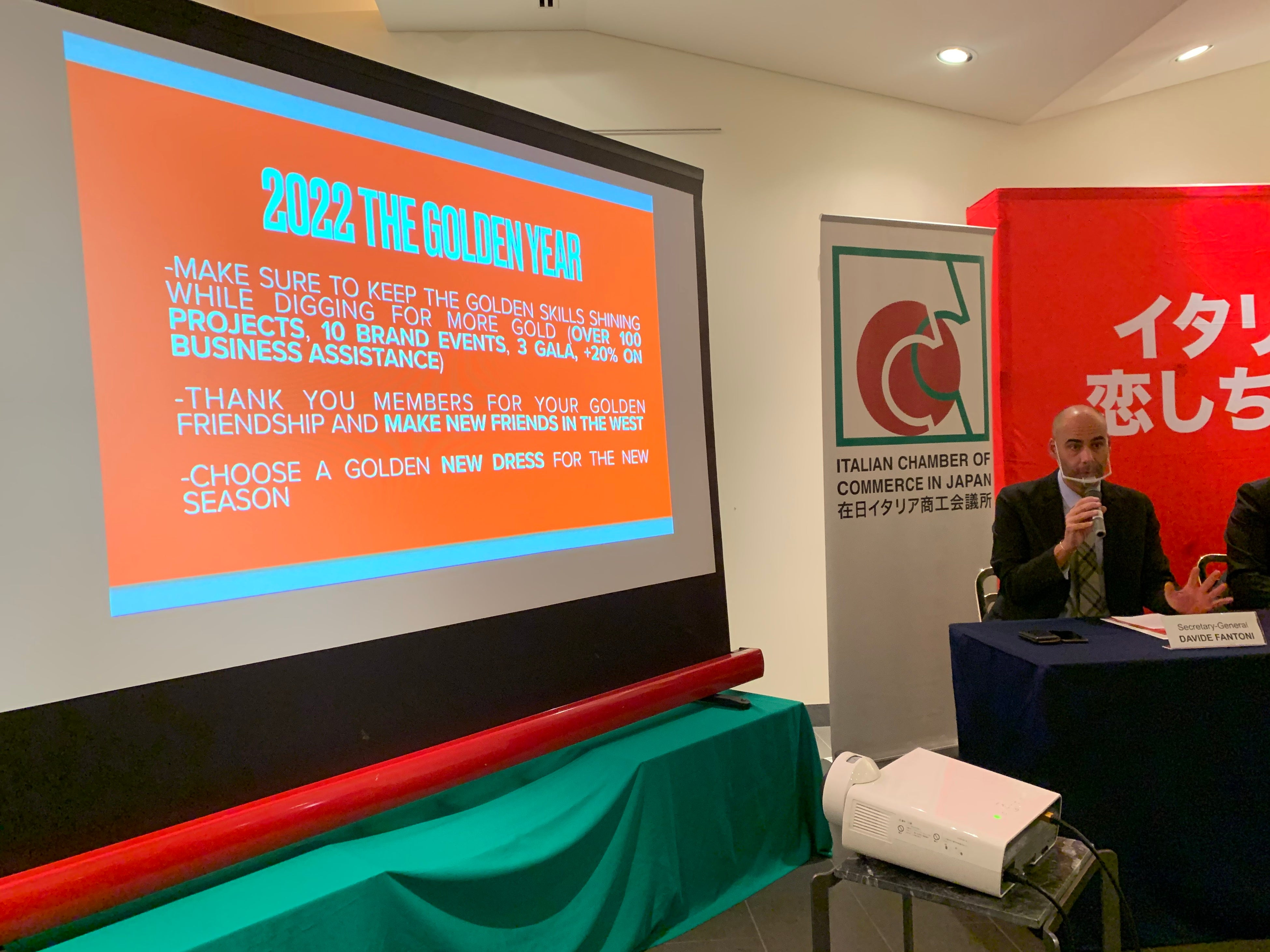 在日イタリア商工会議所の事務局長であるダヴィデ・ファントー二は、2021年に開催した様々なイベント事業(、JOOP2021(世界的な国際オリーブオイルコンペティション)、東京オリンピックに来日したイタリア代表チームを応援するイベントAzzuri, amore mio!2021,イタリア・アモーレ・ミオ!2021、GCC2021(全国イタリア料理コンクール)さらには、昨年初めての試みとして始動した、新規イベント事業である。Festa della Donna・イタリアのMimosa Day2021やMe Diet2021(地中海式食事法をテーマにした国際的なシンポジウム)など成功事例を説明した。新型コロナウィルスが猛威を振るっていた厳しい時であったが、そんな時だからこそ在日イタリア商工会議所からポジティブな発信を重視して、逆境に負けず様々な事に挑戦して成功を収めたと話した。今年の取り組みについては、昨年同様のイベント事業を積極的に行うことや、現在は、東京がメインの拠点であるが、今後は名古屋・大阪・九州など西日本での活動も拡大していくことを目標としていることを発表した。毎年恒例の在日イタリア商工会議所主催ICCJ Gala&Dinner Concert については、東京だけ今年は三大都市(東京・名古屋・大阪)での開催を計画している。また、「一般社団法人・在日イタリア商工会議所」として、組織的にも新たなスタートを図る。