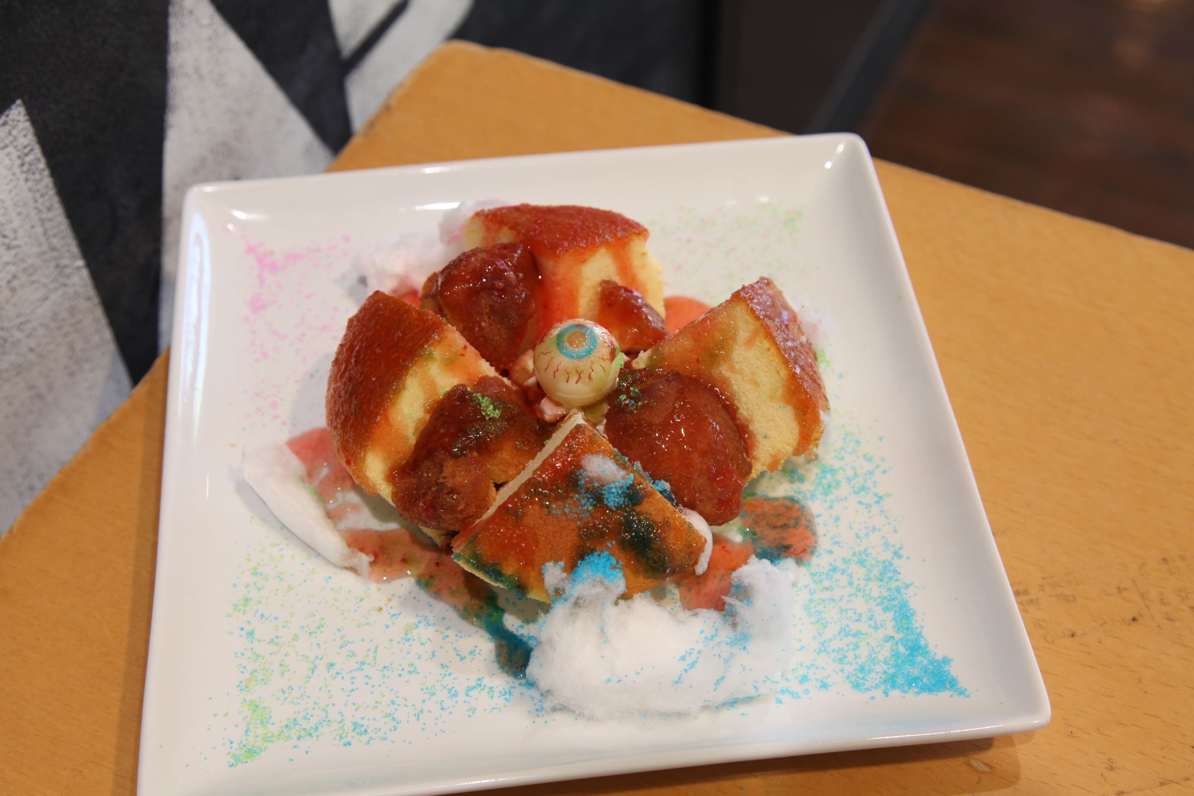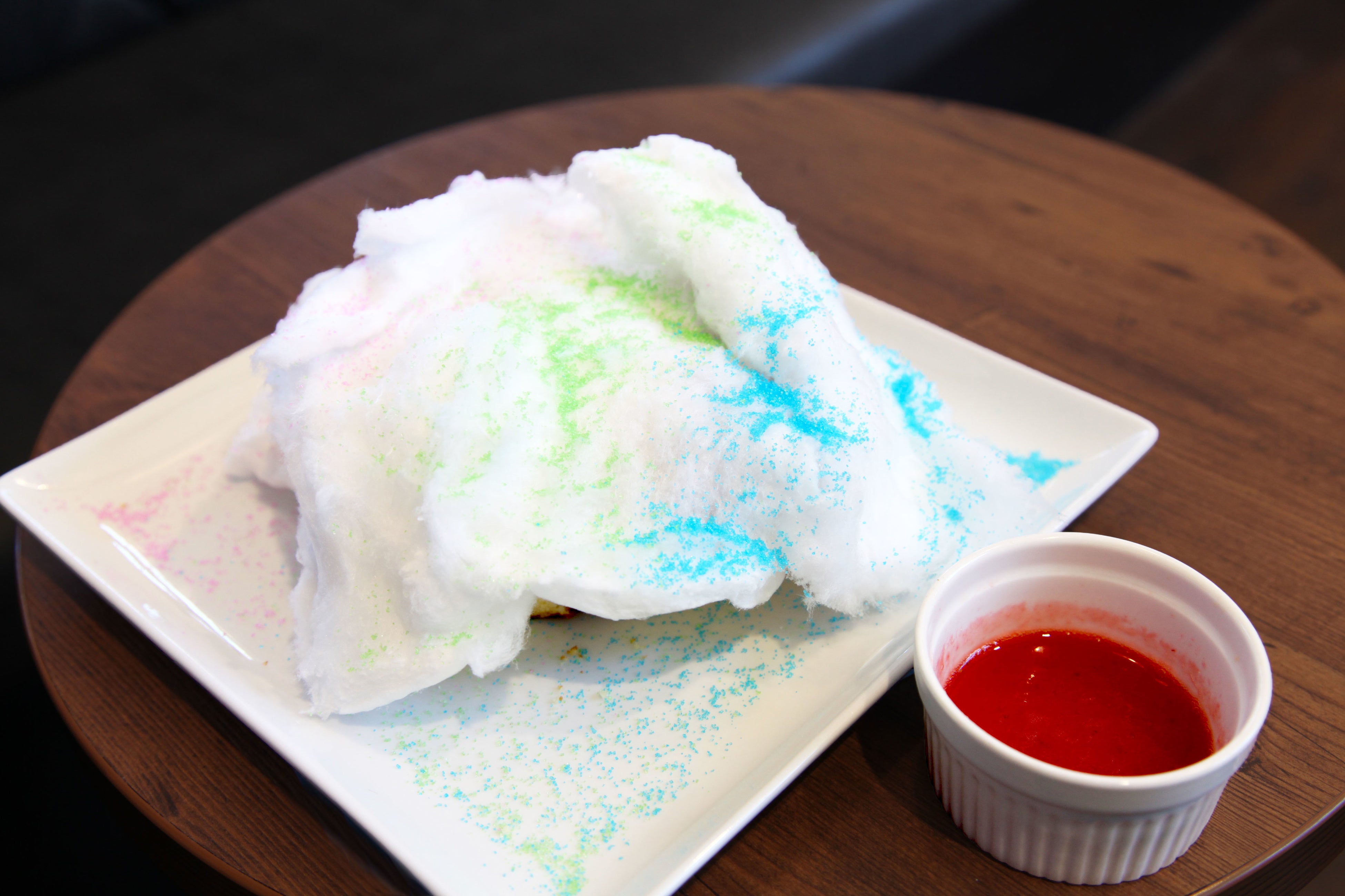 パンケーキにイチゴソースをかけると、わたあめが溶け出して中から…。