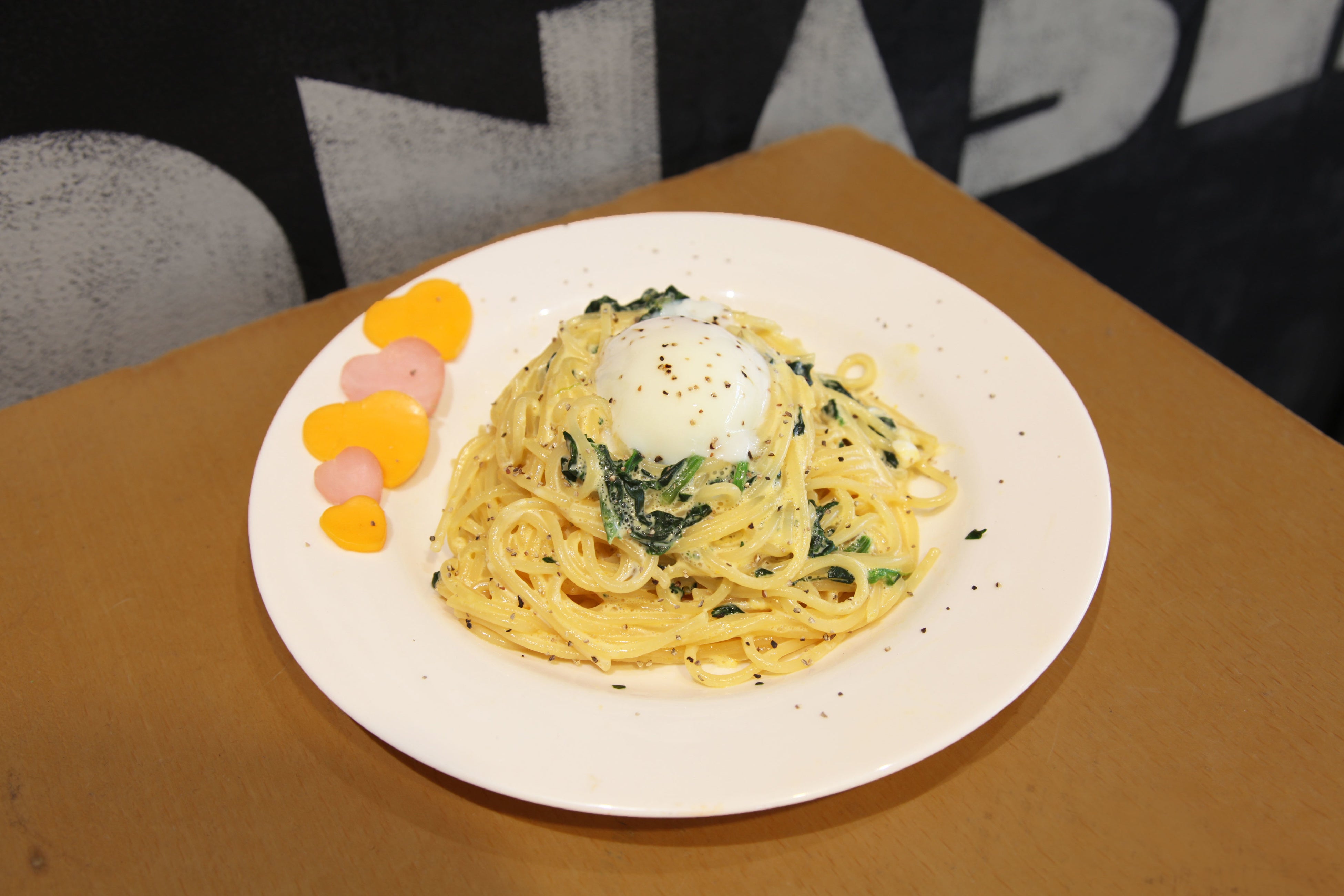 長い食べ物は昔から縁を結ぶといわれています。ハートでおめかししたカルボナーラであなたの恋を応援!