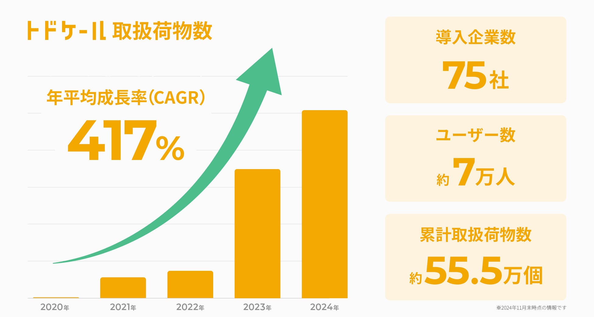 サービス全体の利用顧客数は大手企業を中心に70社を超え、システム内取り扱い荷物数の成長率はこの4年間において、年平均417%を超えております。