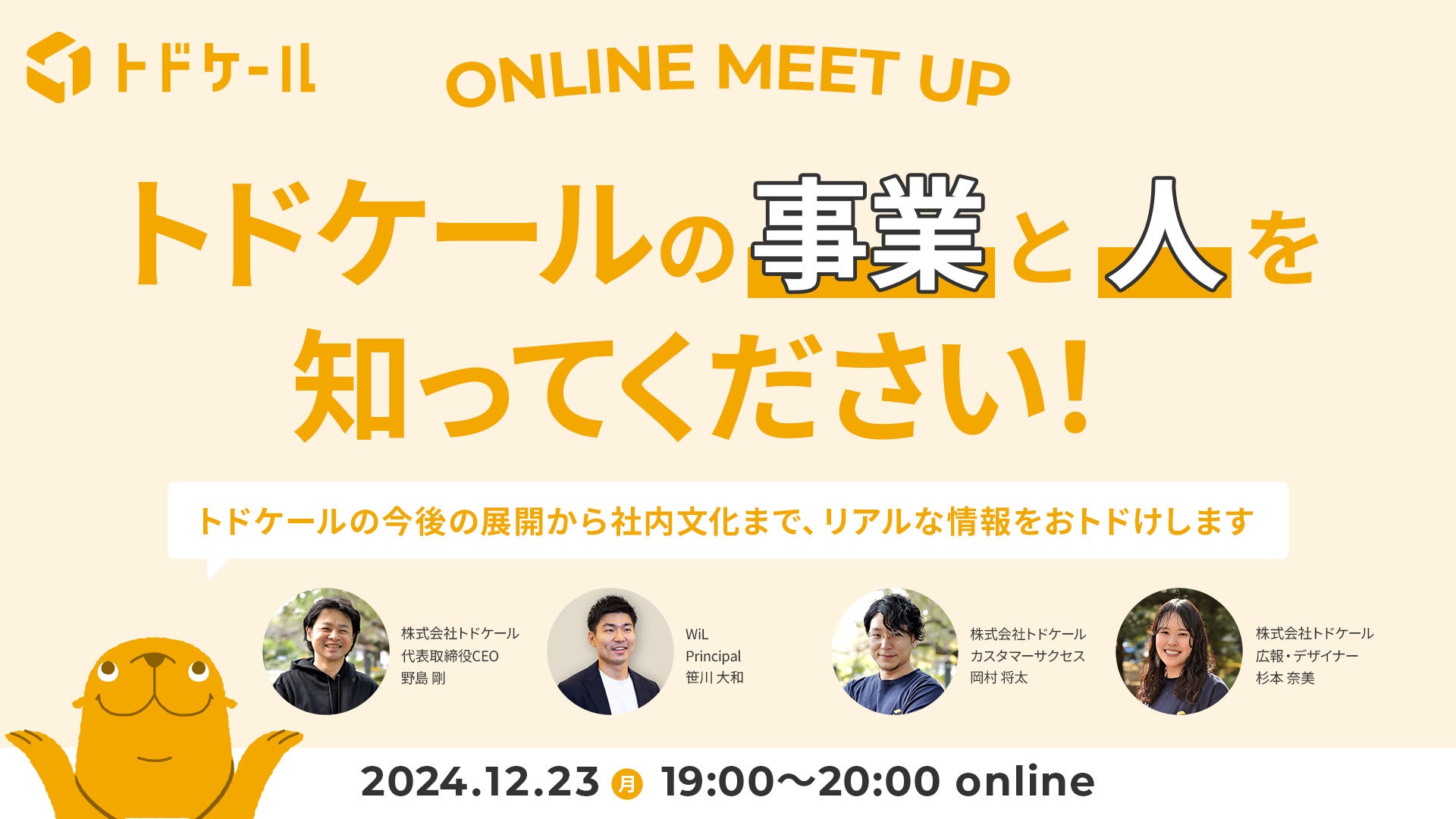 トドケールはこのシリーズA調達を機に、多くのポジションの募集を開始しております。トドケールからはPMF完了までの苦難やこれからの事業の方向性や戦略、10月に移転したオフィスのご紹介、働く社員の声のほか、本ラウンドでリードをとった新規株主であるWiLのトドケール担当キャピタリスト笹川氏からは投資家からみたトドケールの魅力などなど、公にはしていない多くの内容を皆様におトドけしたいと思っています。