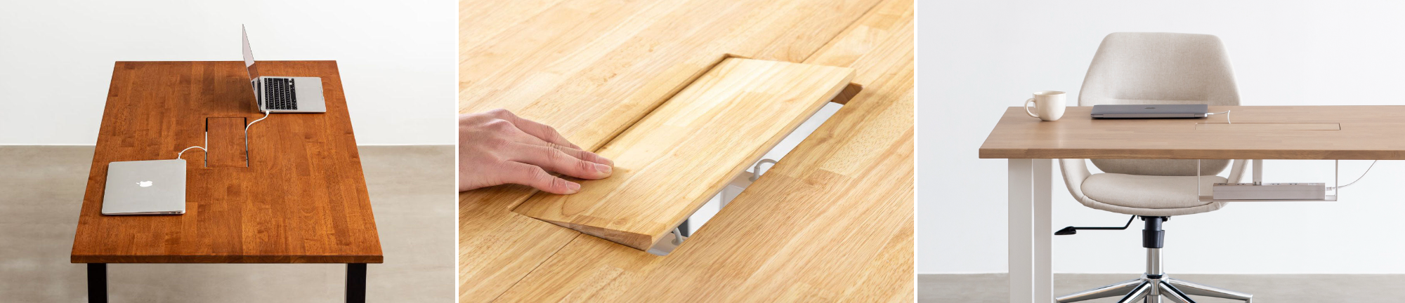 長方形の木製ブロック+アイアン製電源タップ用トレーがセットになった配線孔です。ブロックはテーパー加工を施しているので簡単に取り外しができ、 PCアダプターの取り外しや電源タップのスイッチのオンオフが容易です。(ブラック、ホワイトのみ展開)