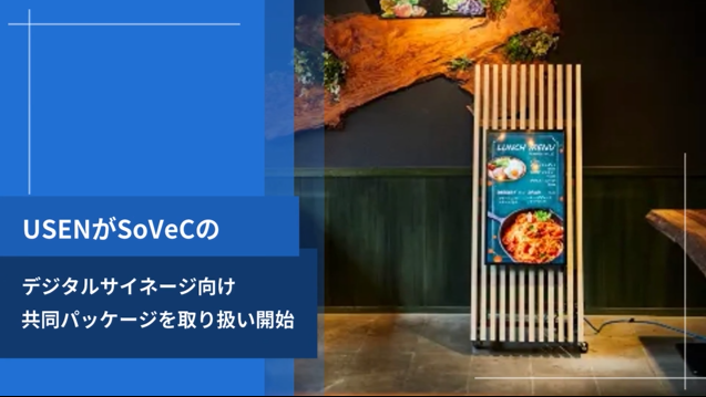 SoVeC(ソベック)株式会社(本社:東京都品川区、代表取締役社長:上川 衛、以下「当社」)は、USEN-NEXT GROUPの株式会社USEN(本社:東京都品川区、代表取締役社長:田村 公正、以下「USEN」)が、当社のデジタルサイネージ向け共同パッケージの取り扱いを開始したことをお知らせします。